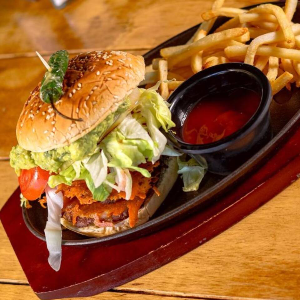 Deliciosa hamburguesa de dos carnes, acompañada de queso gratinado, tocino,guacamole y dip de habanero
