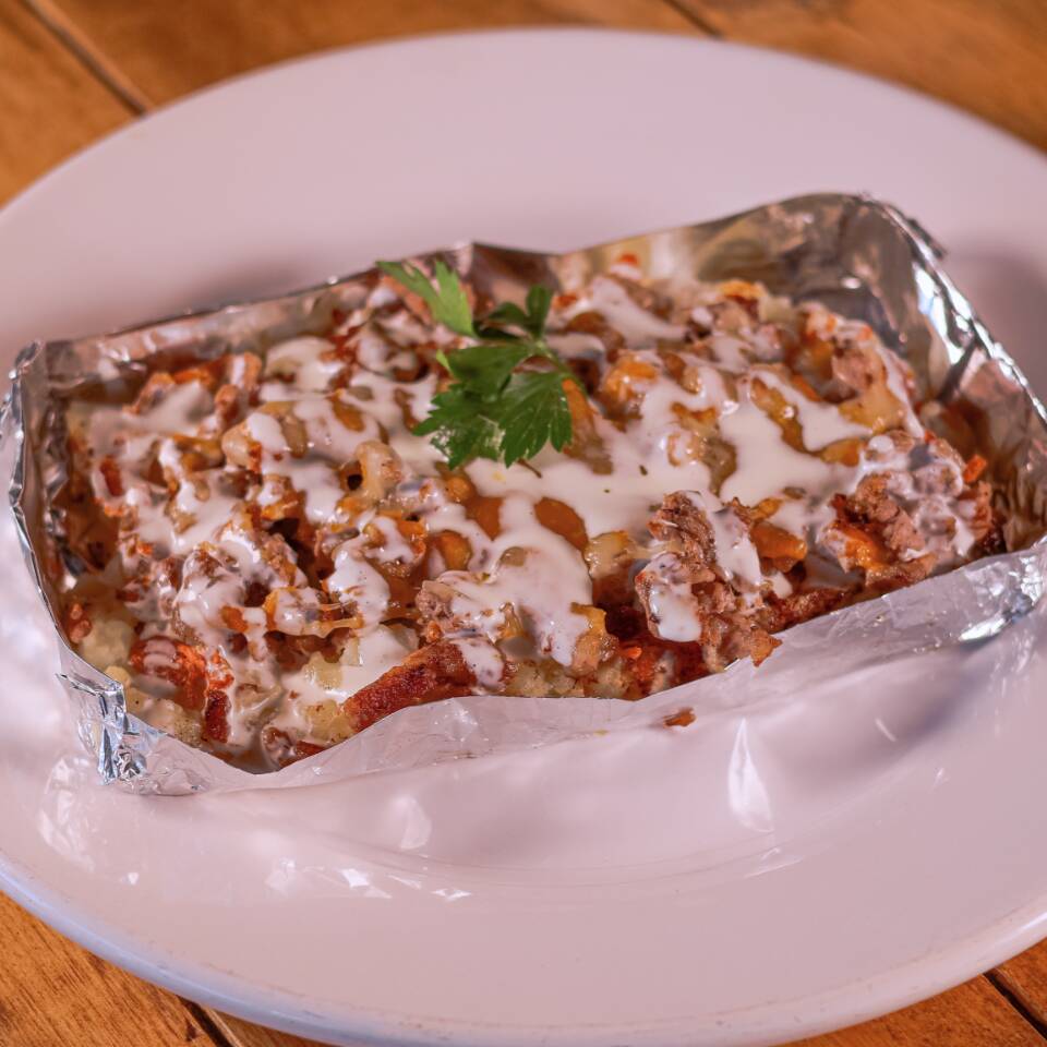 Papa rellena de bistec tierno, cubierta con queso gratinado. ¡Una explosión de sabor en cada bocado!