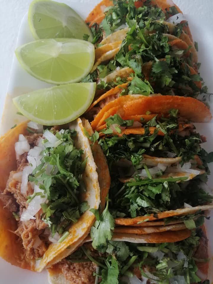 Taco de doble tortilla, verdura, salsa verde o roja, limones.