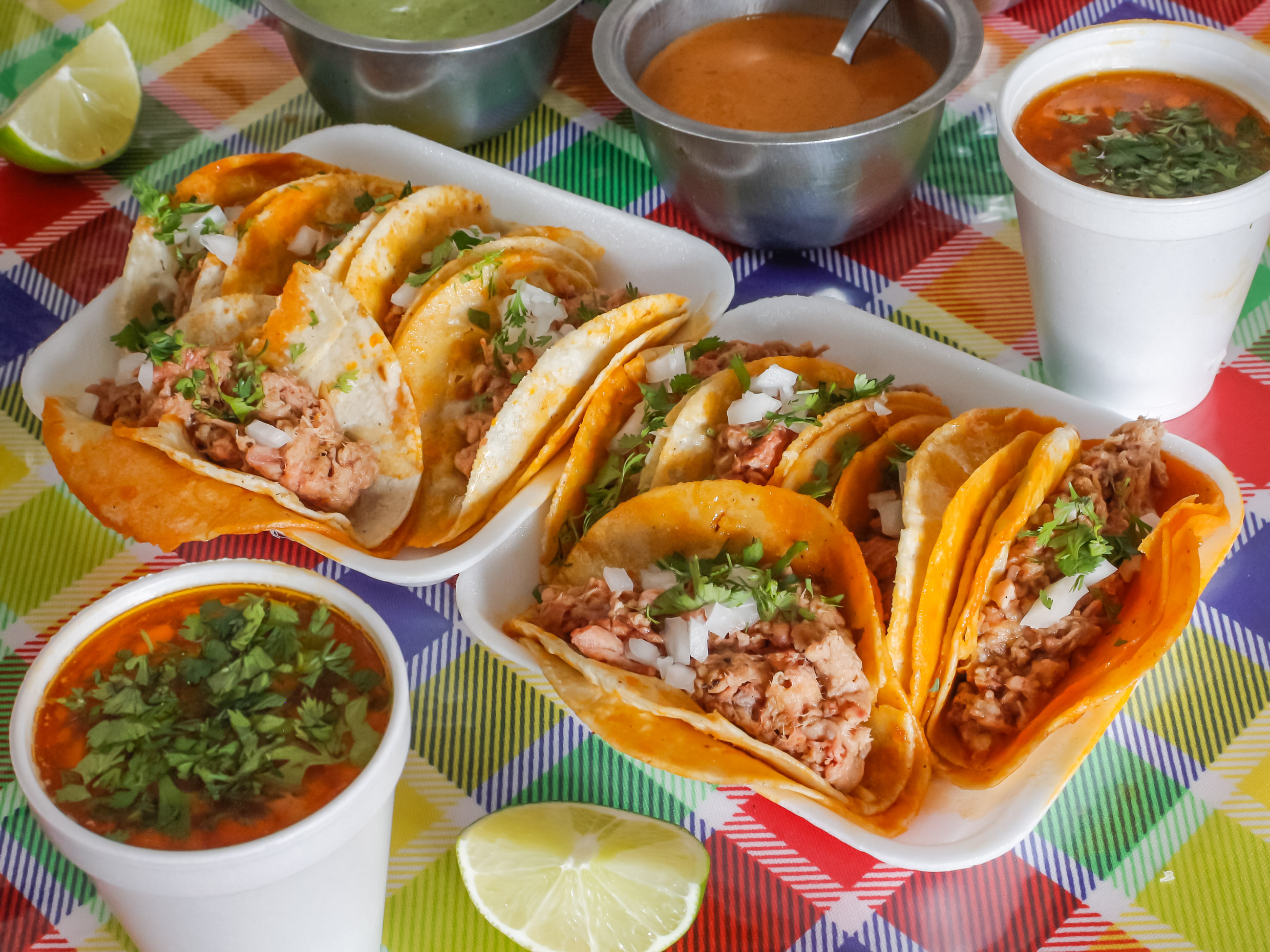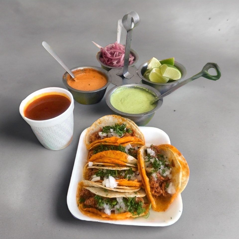 16 tacos de barbacoa y gratis 3 consomés, incluye las 3 tipos de salsas.
