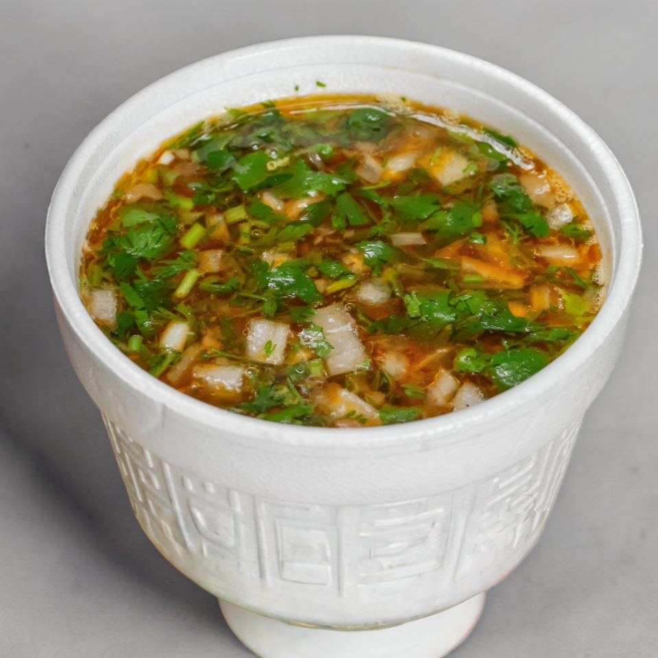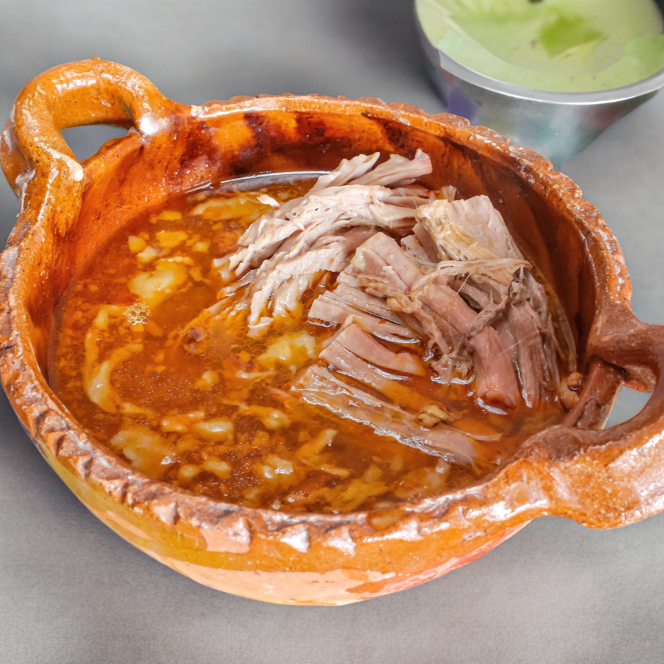 Consomé con barbacoa, verdura, limones, salsa roja de aceite.