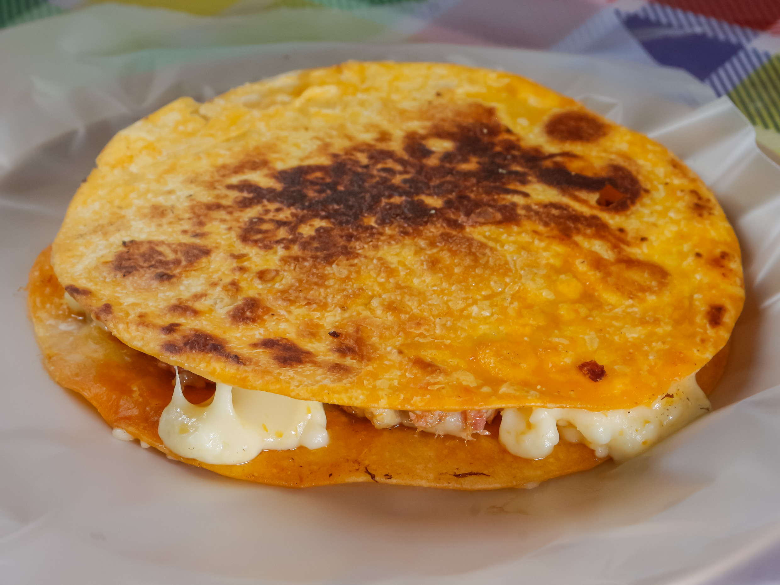 Quesadilla de barbacoa (tortilla de harina) con queso manchego, verdura, limones, salsa verde o roja.