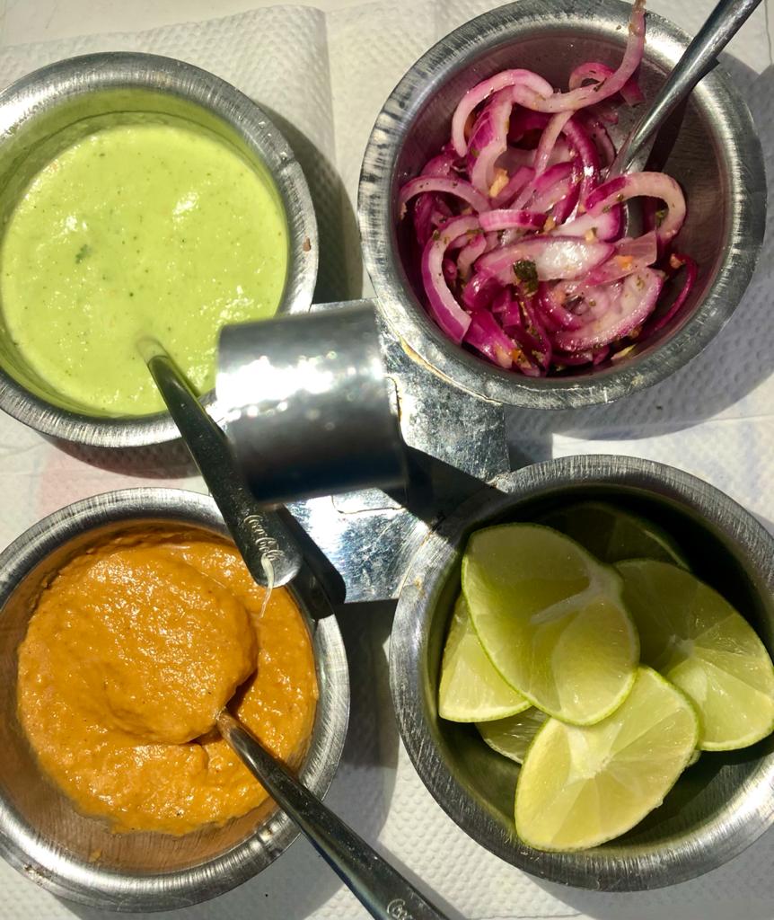 Verde (de cilantro), roja (de habanero), cebollitas moradas.