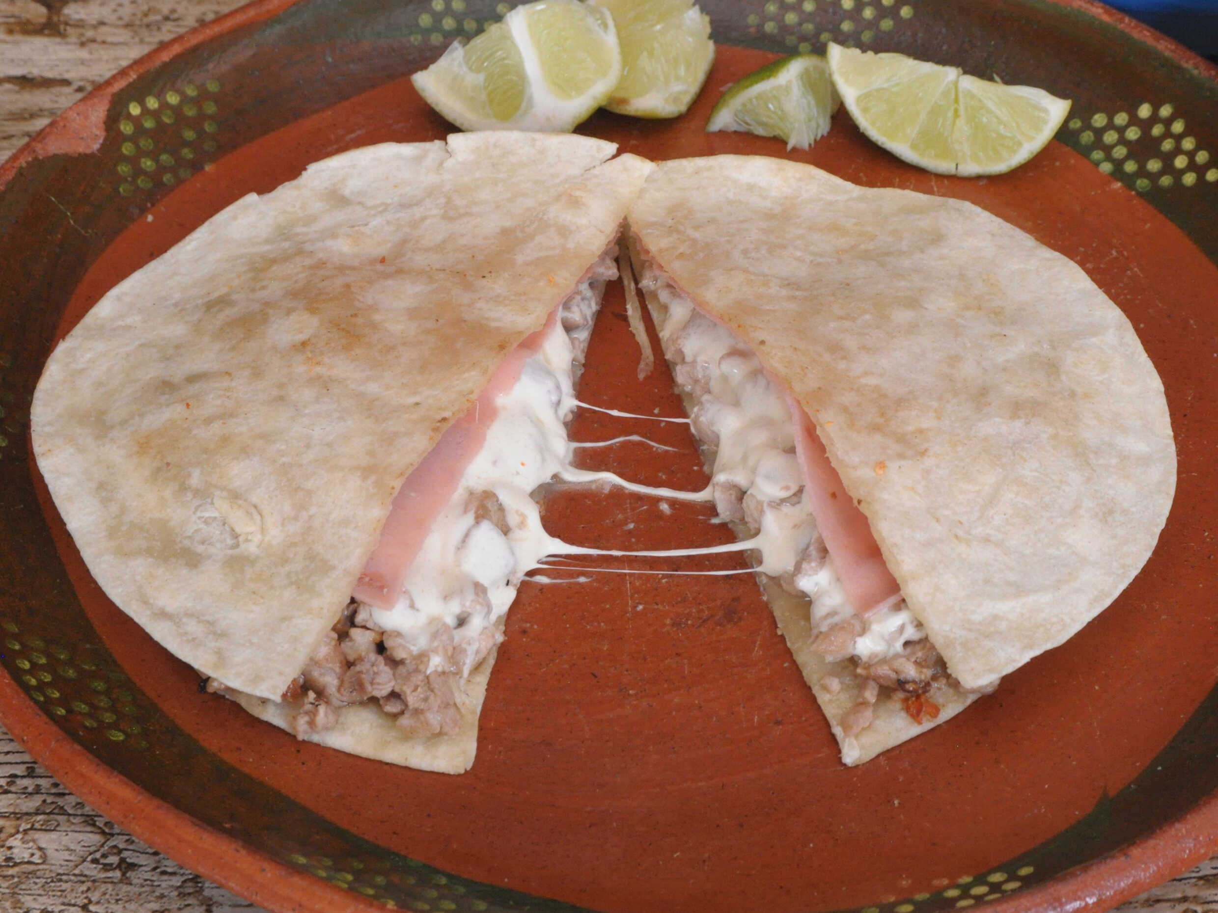 Chuleta, jamón, queso oaxaca y queso amarillo.