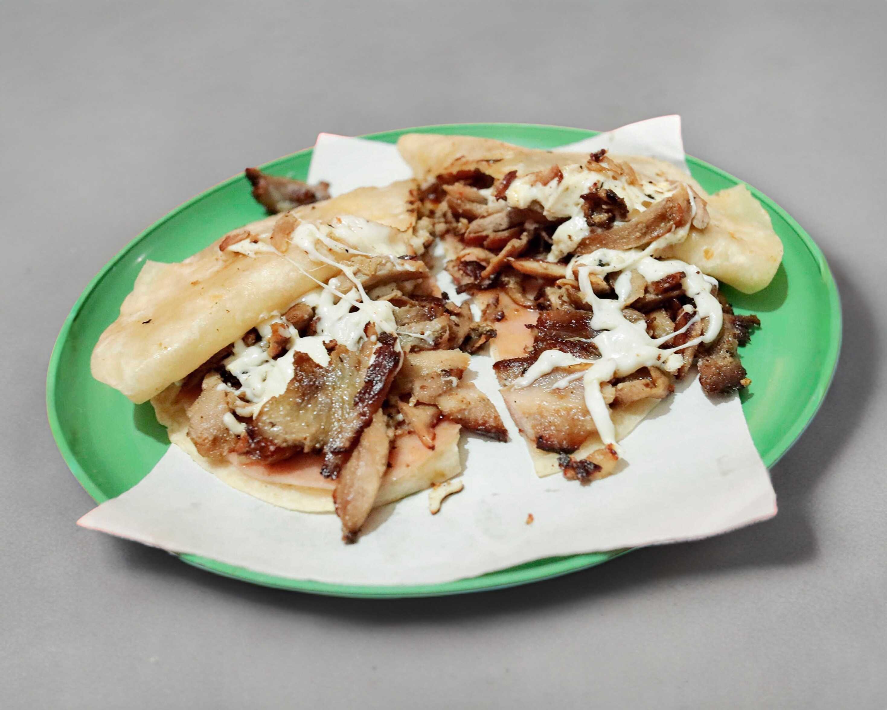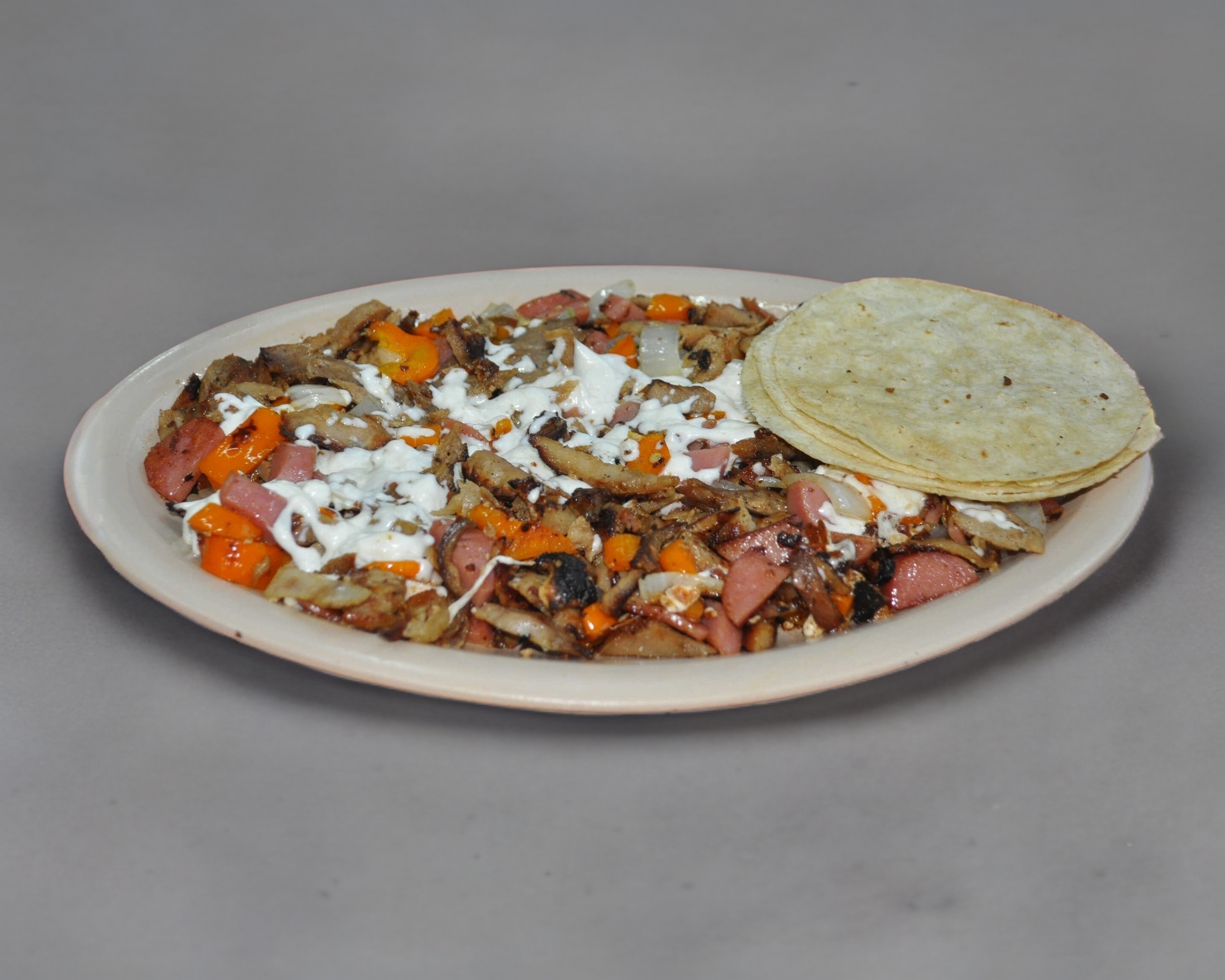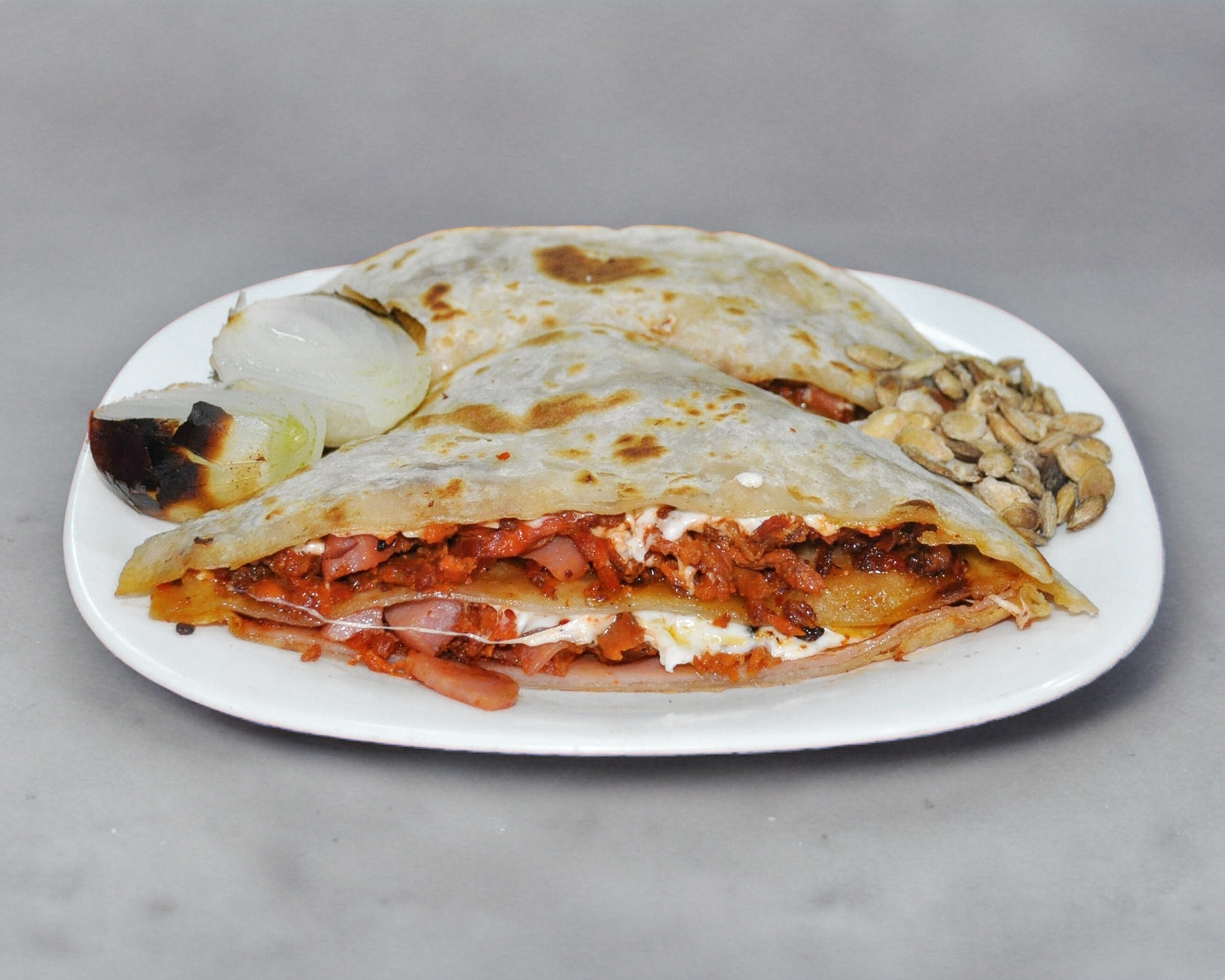 Pastor, longaniza, salchicha, jamón y queso. Más tres tortillas de harina.