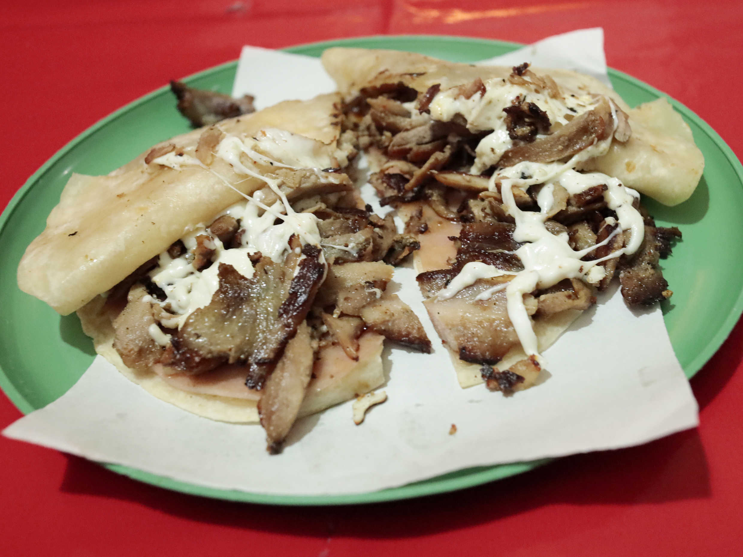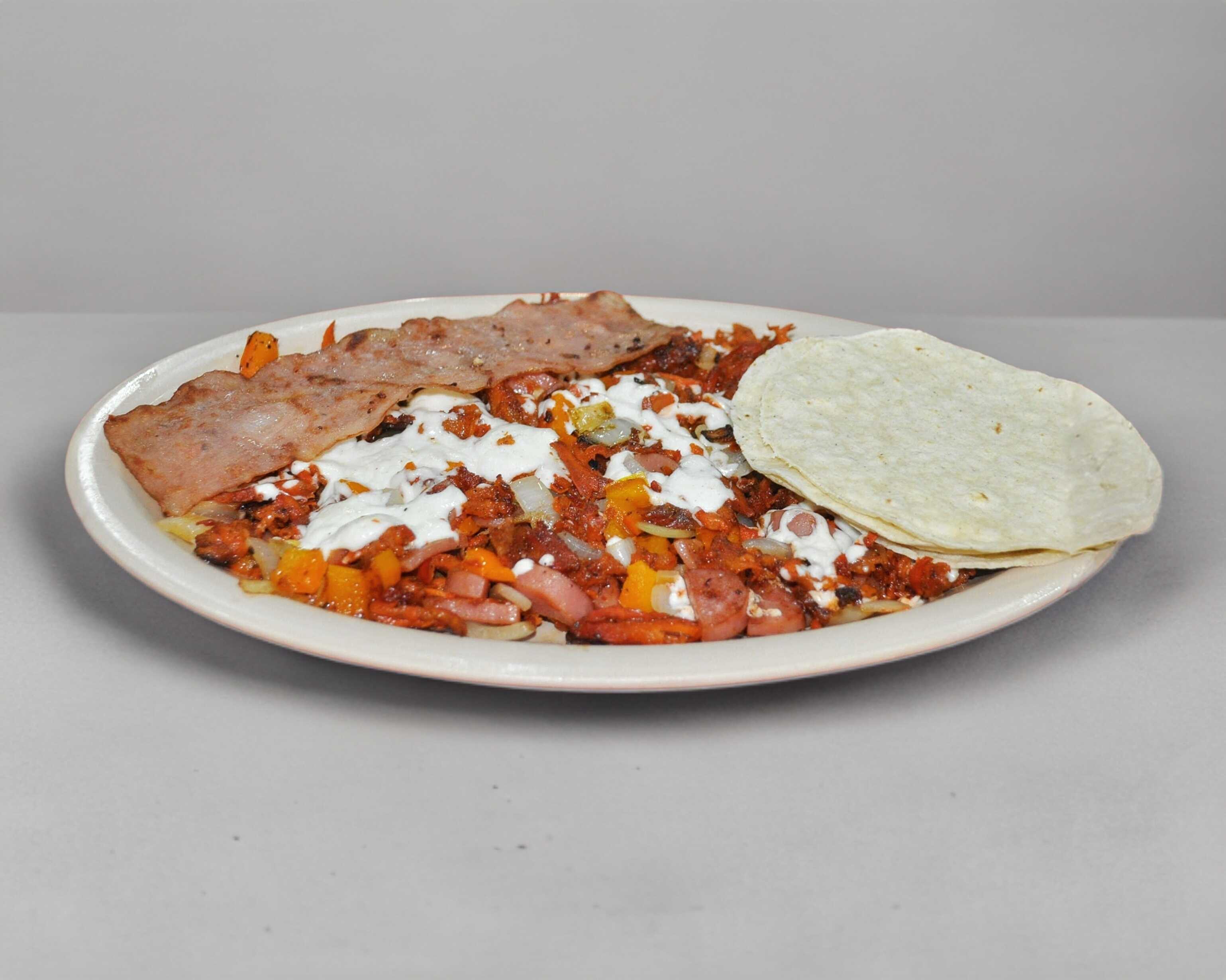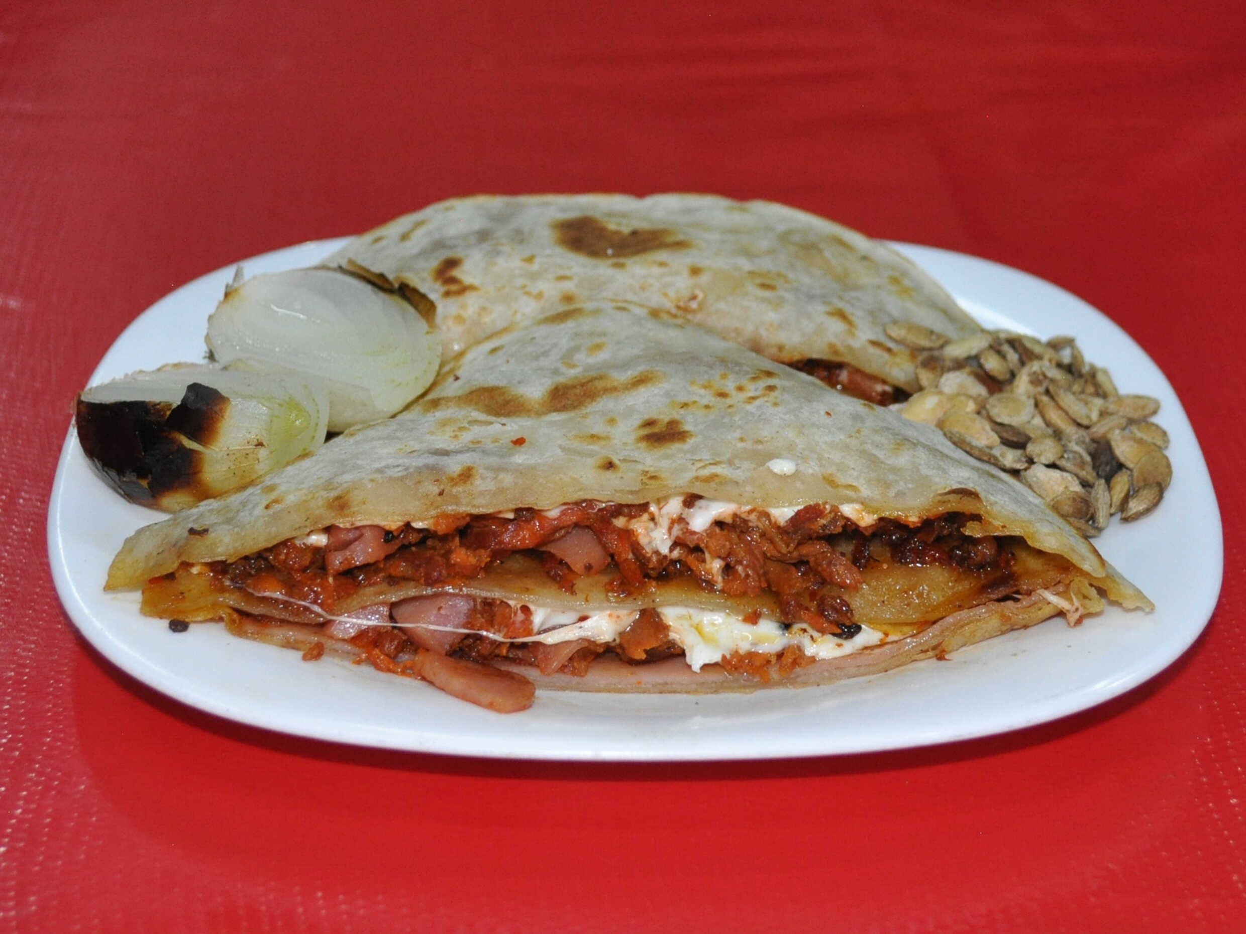 Pastor, longaniza, salchicha, jamón y queso. Más tres tortillas de harina.