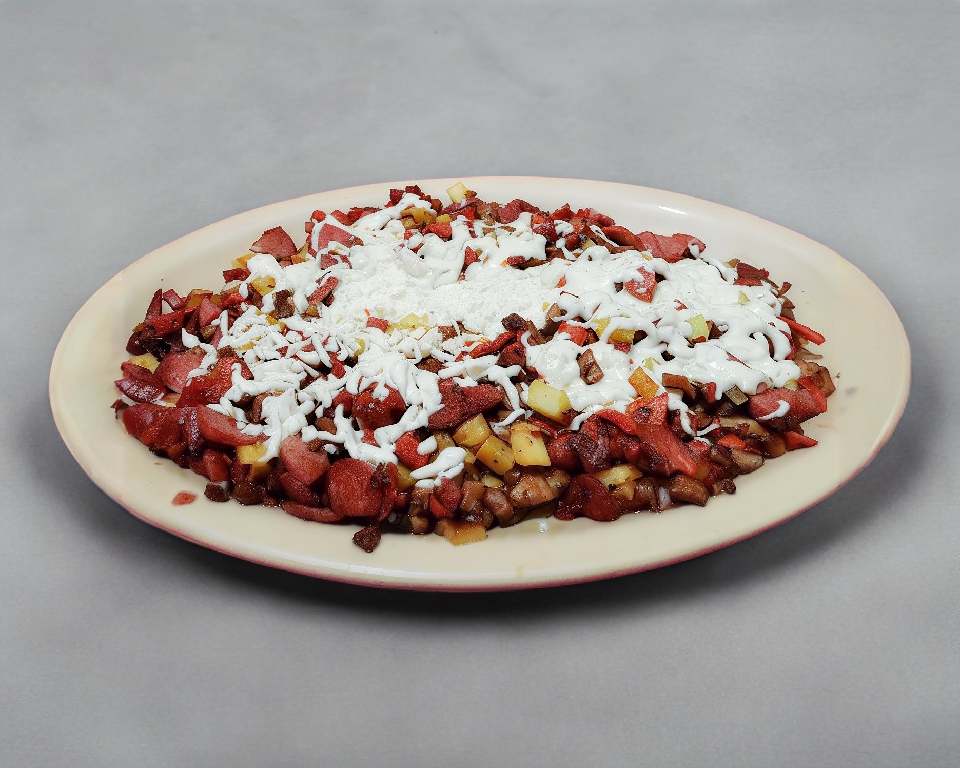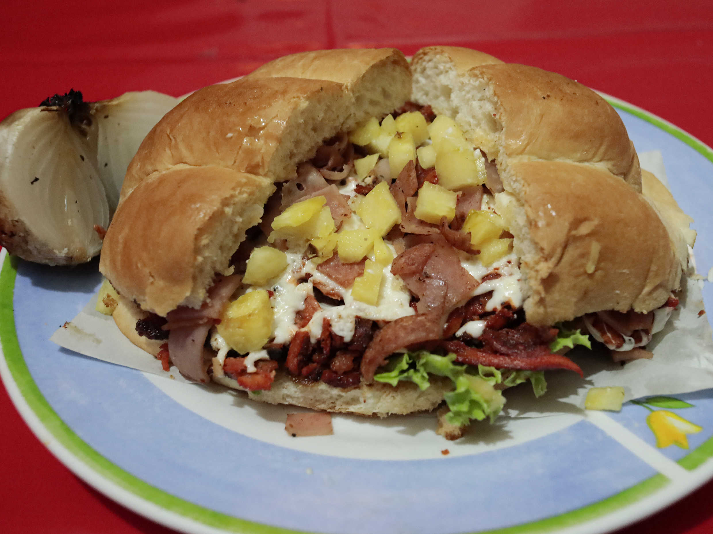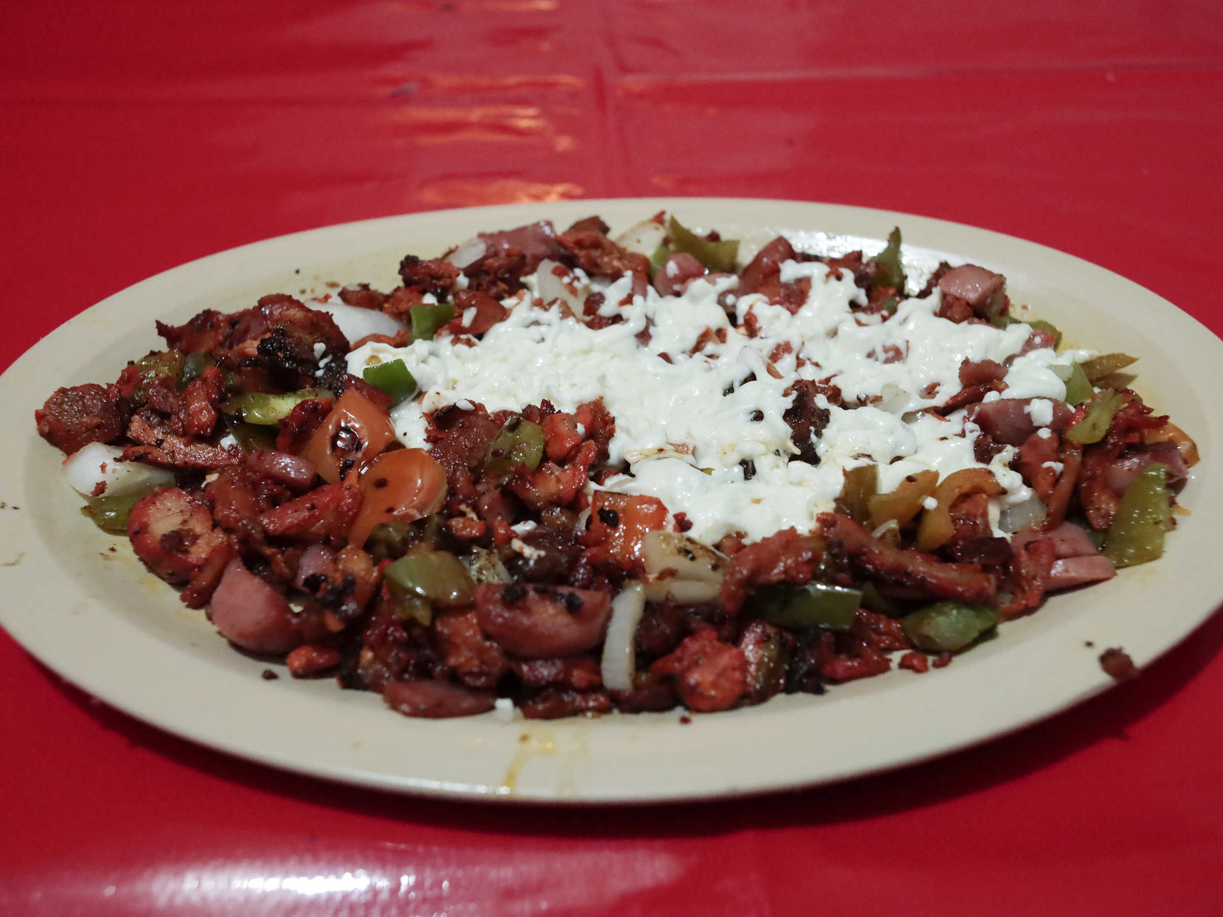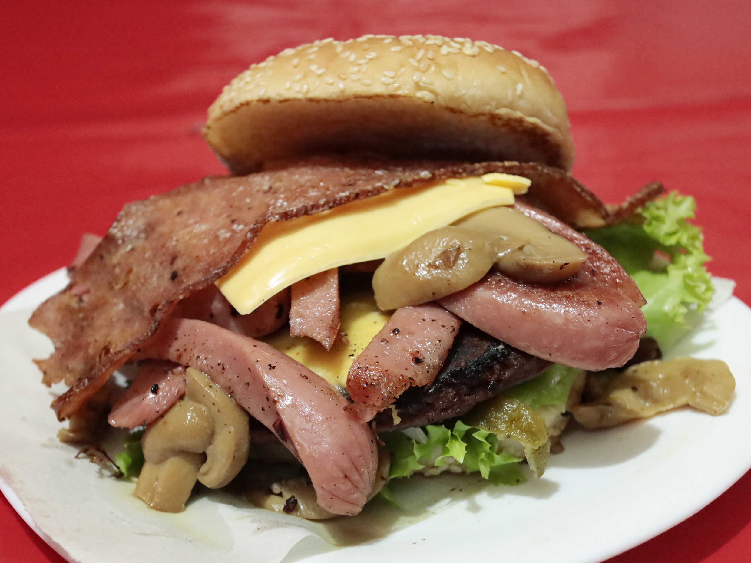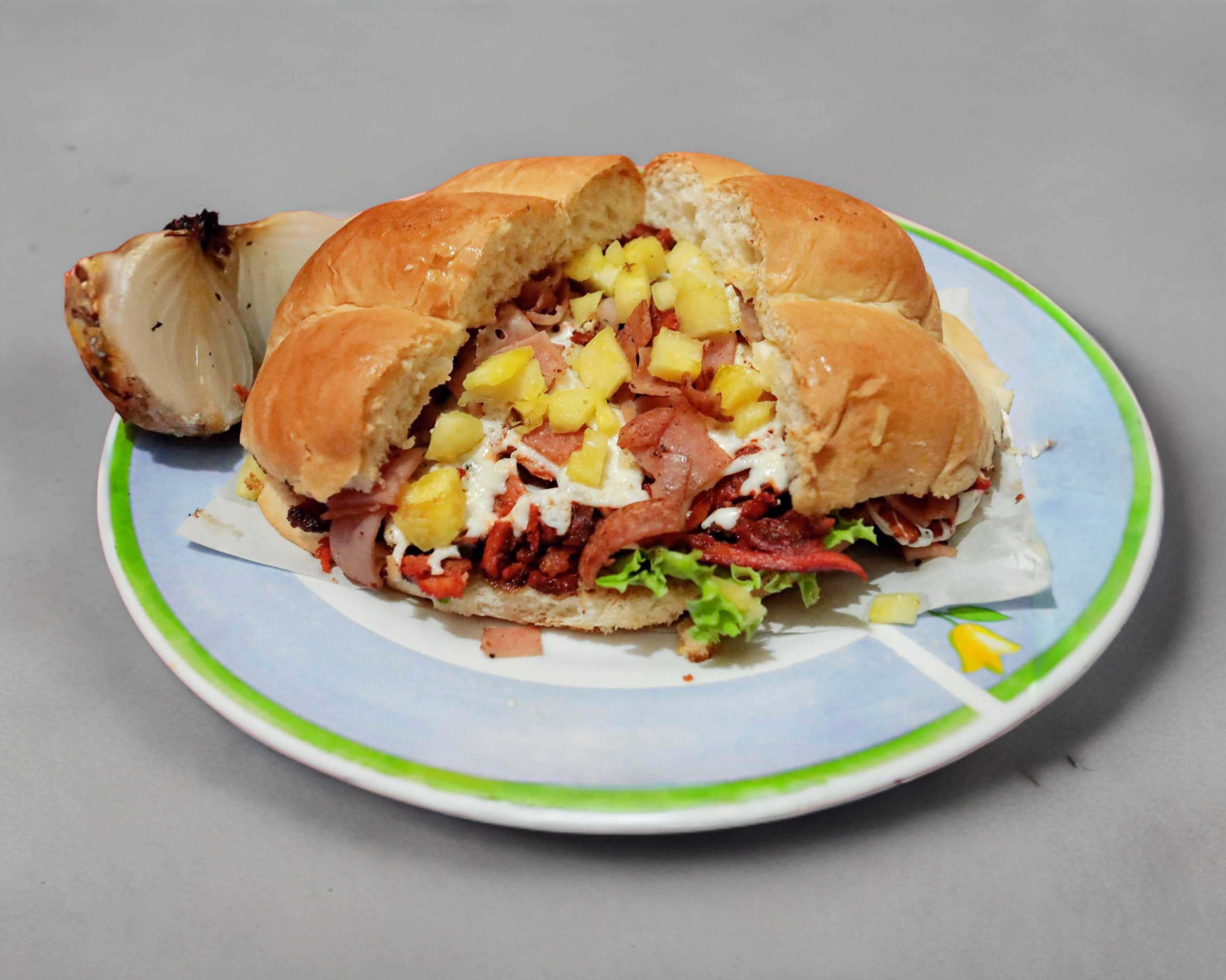Bistec, jamón, salchicha, morrón, cebolla y queso.