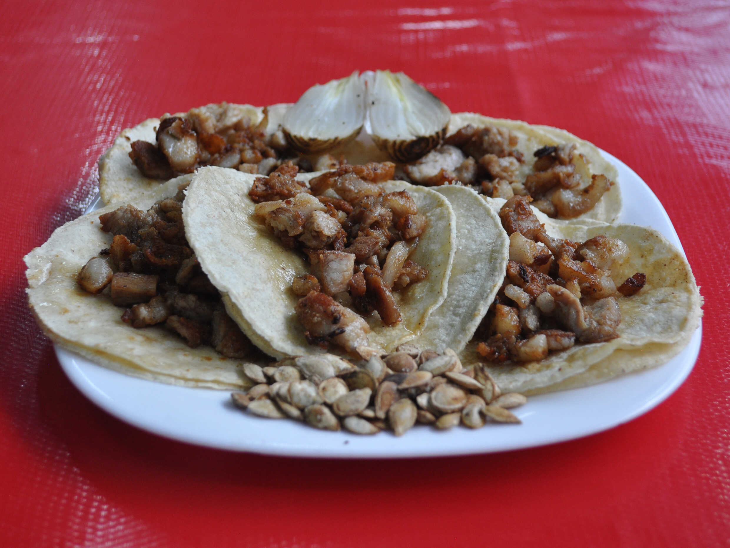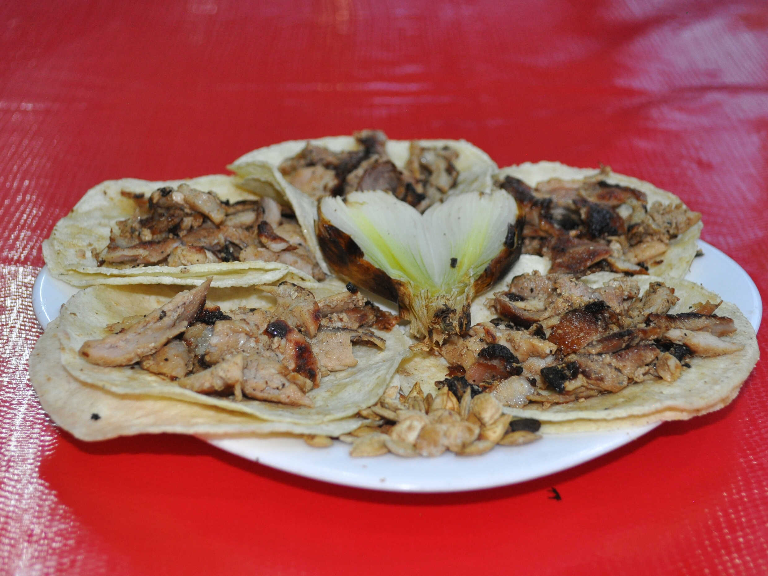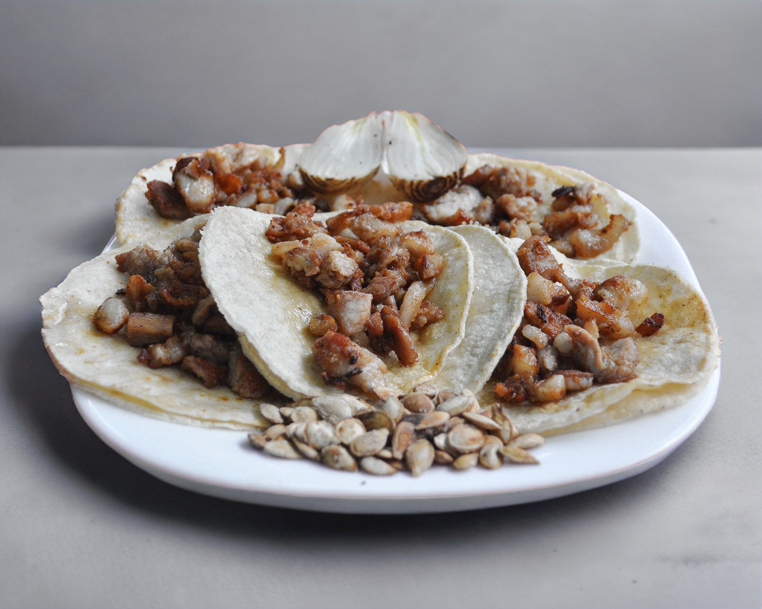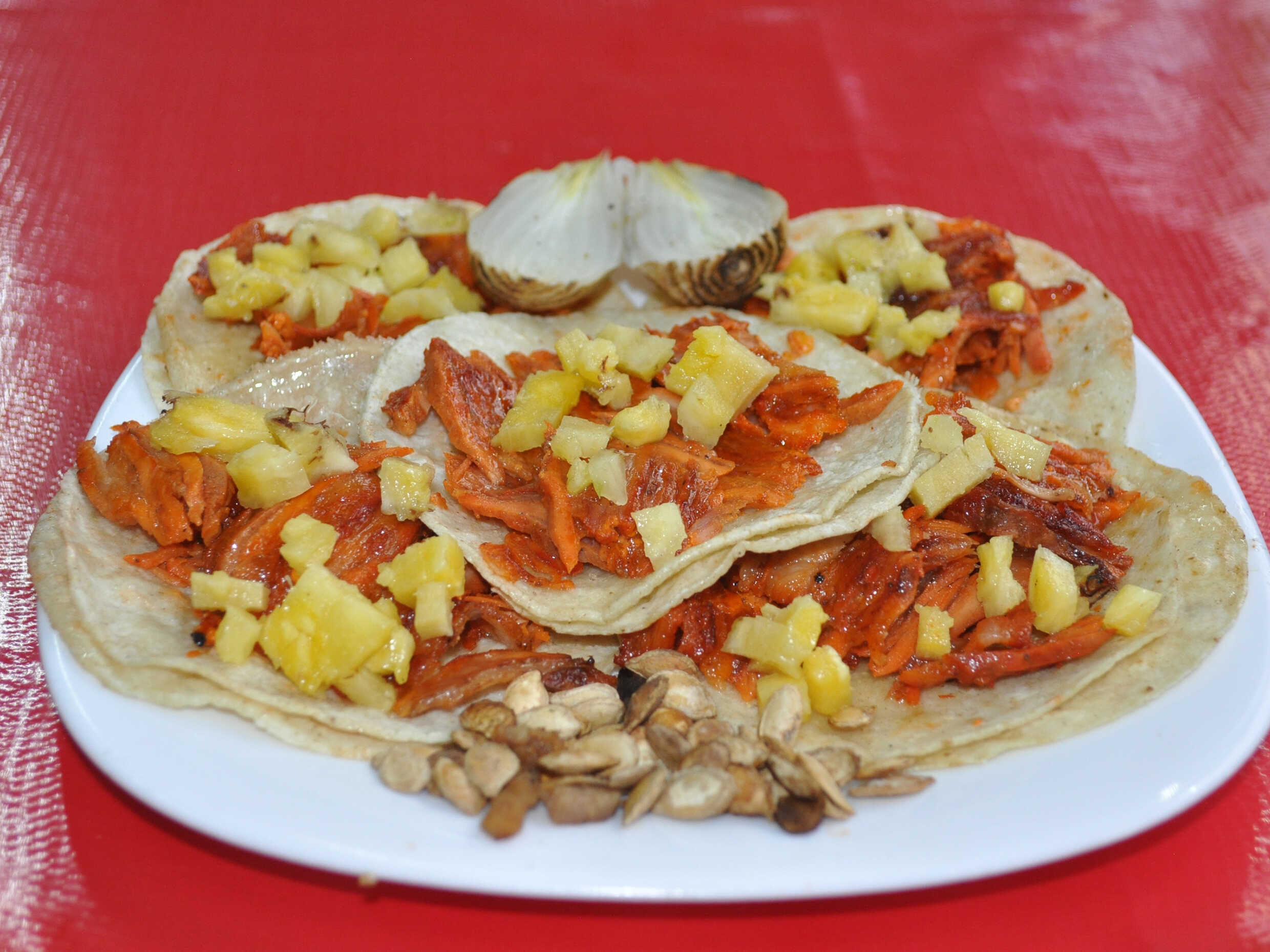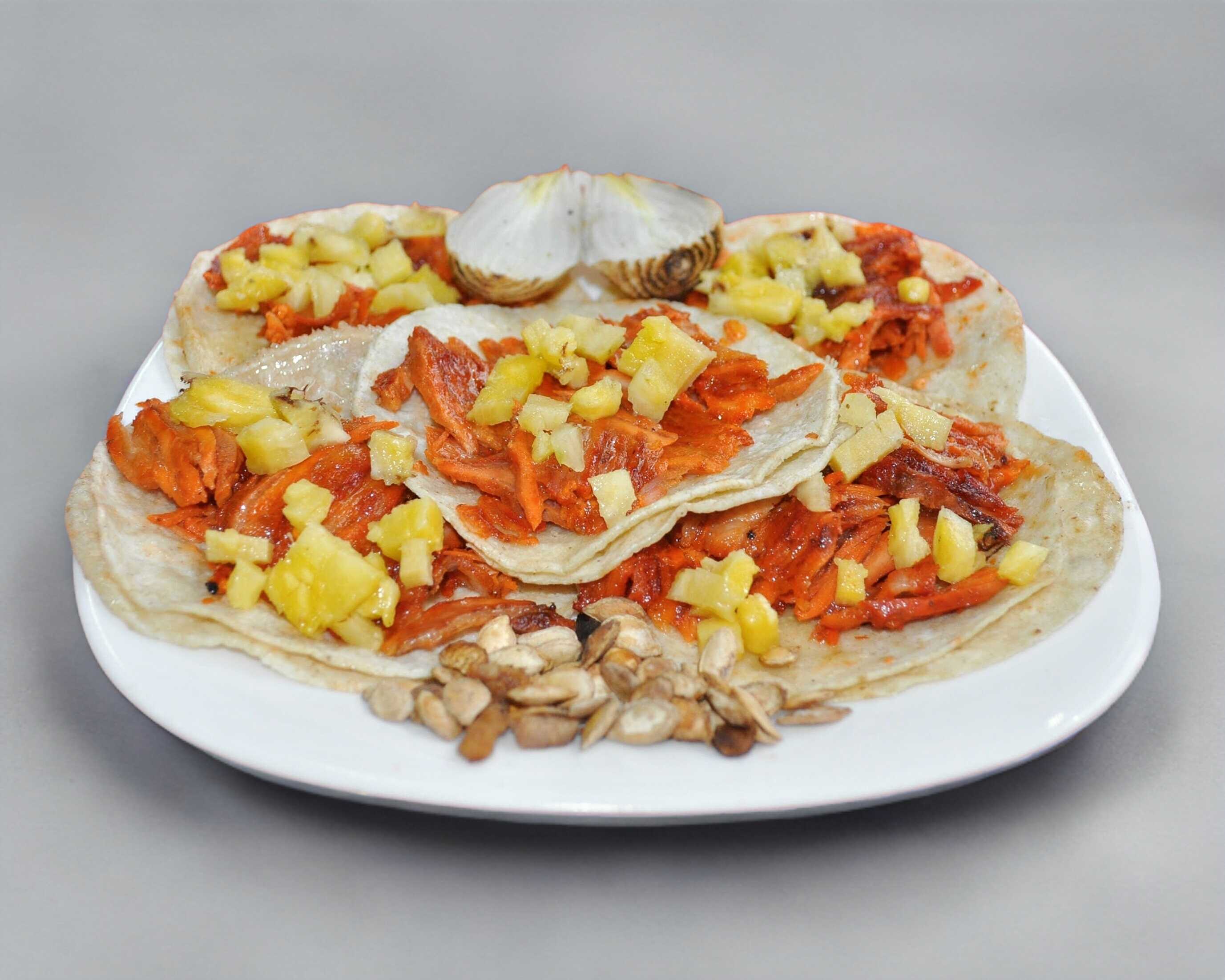 1 porcion personal (1 unidad )Dos tortillas de maiz con carne al pastor (40 a 45 gramos ) , acompañadas de cebolla, cilantro, piña y salsa a elección.