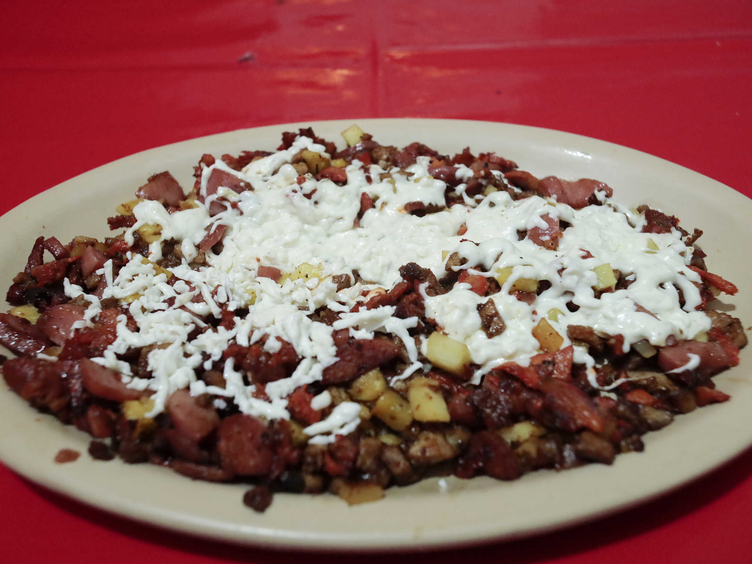 Carne al pastor, tocino, jamón, salchicha, morrón, cebolla y queso.