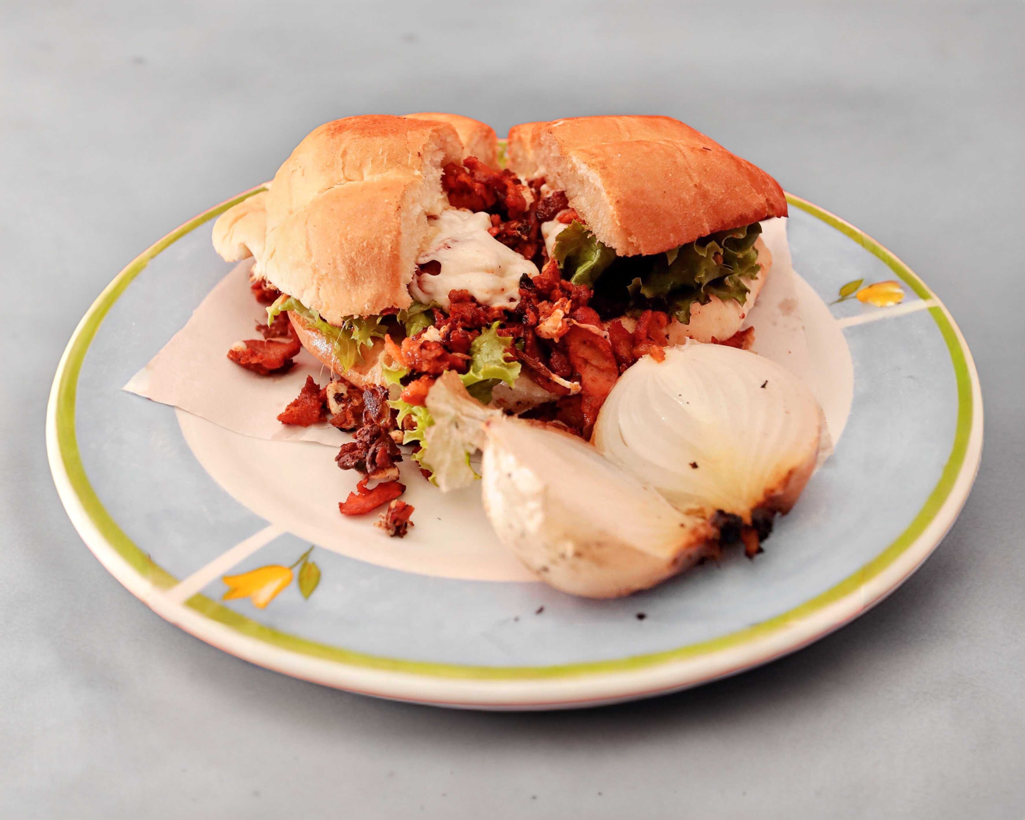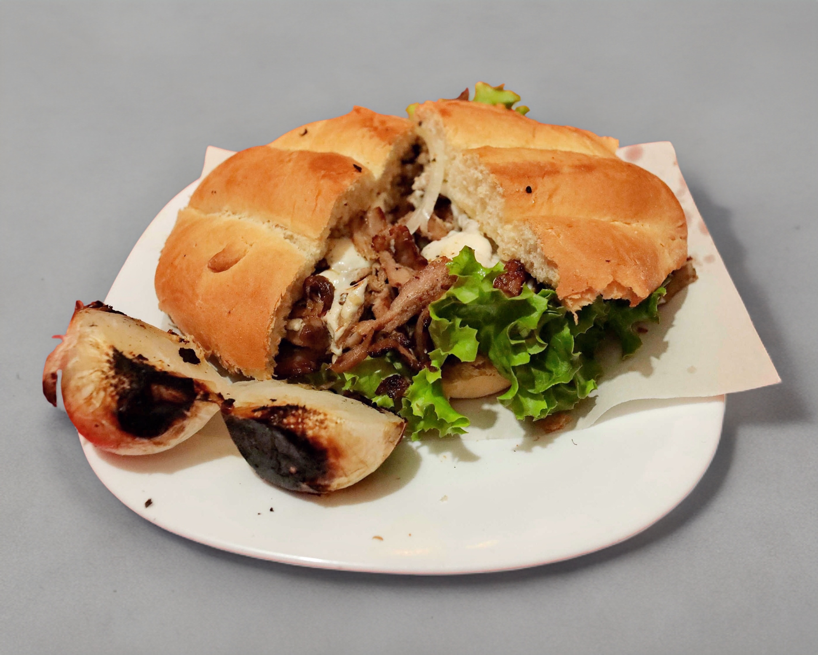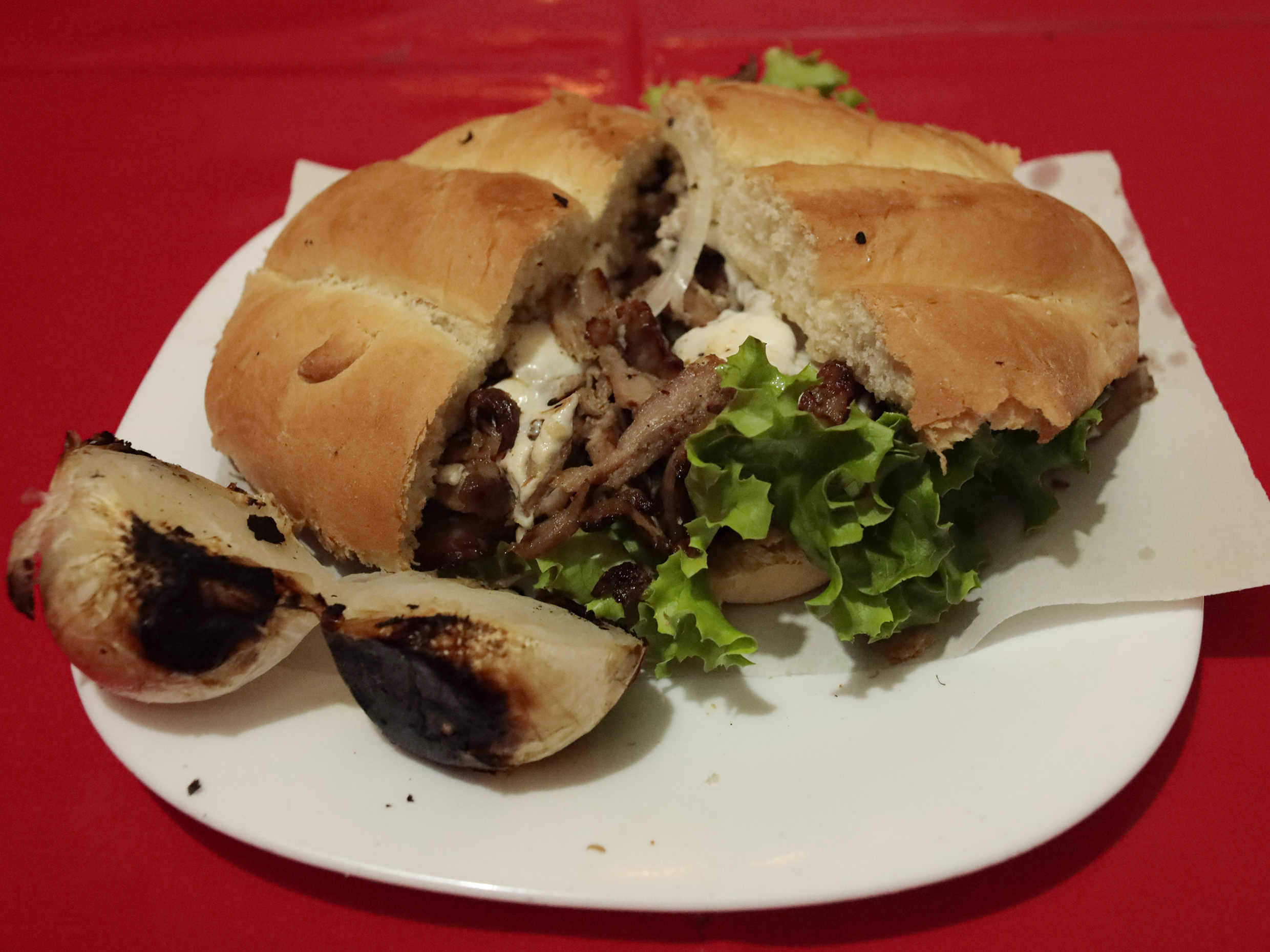 Delicioso pan relleno de carne al carbón y queso, acompañado de lechuga, cebolla y jitomate.