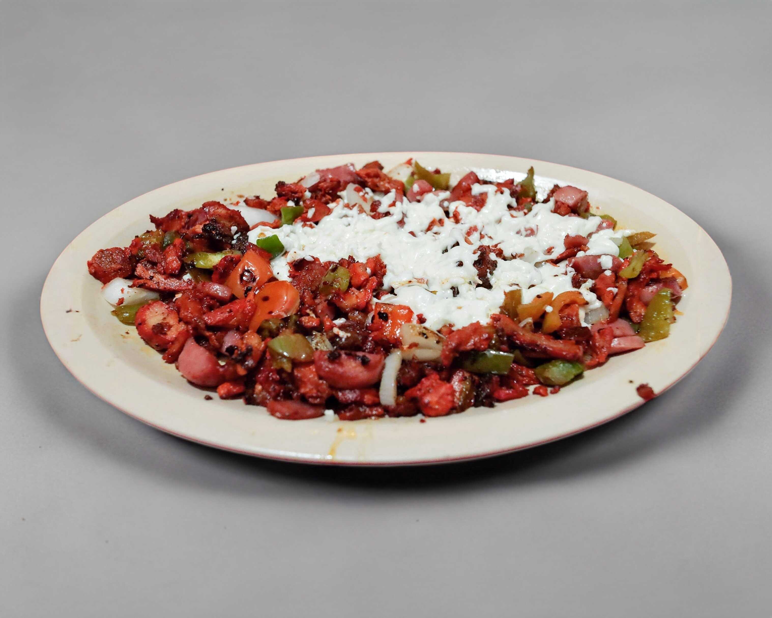 Carne al carbón, salchicha, jamón,v morrón, cebolla y queso.