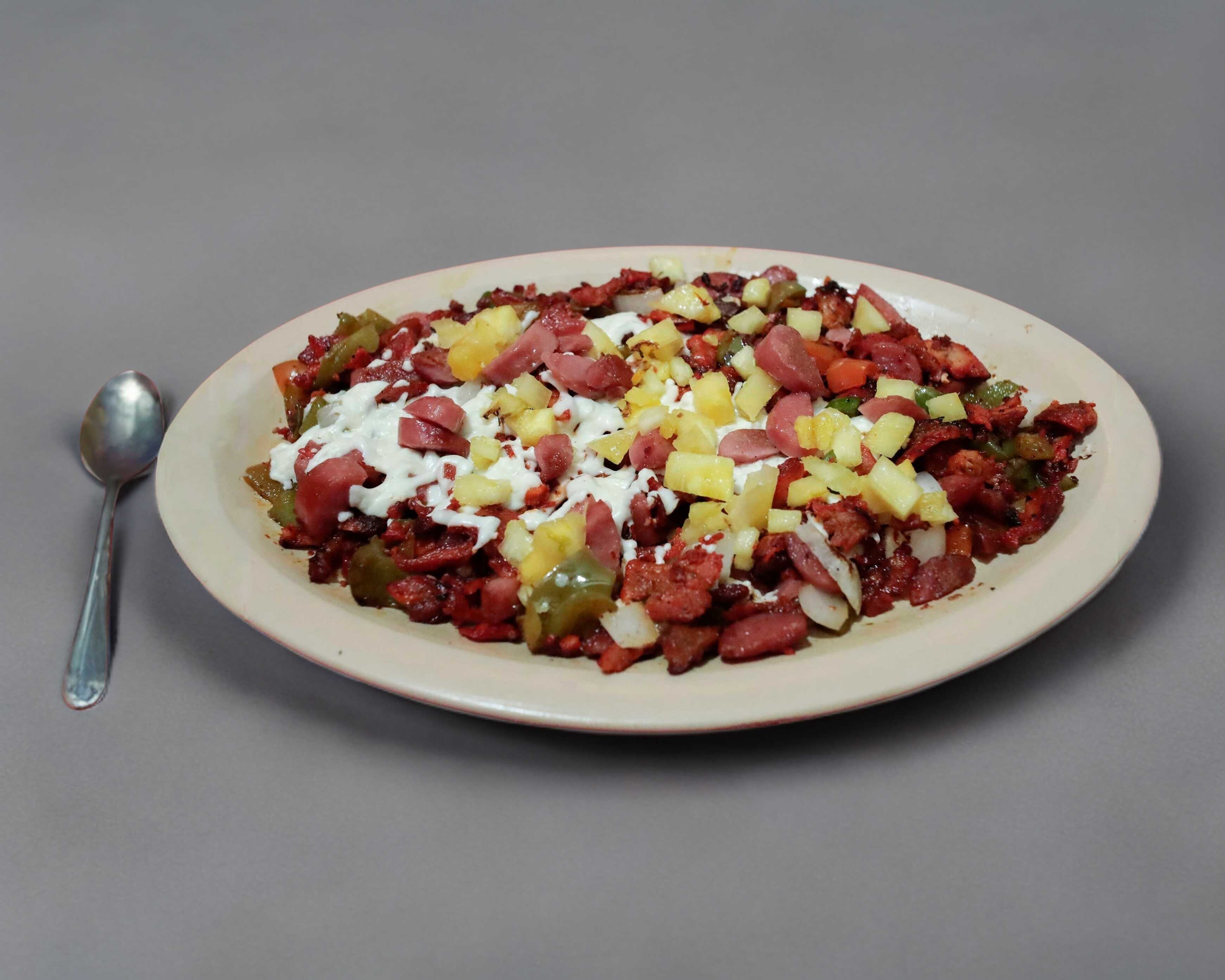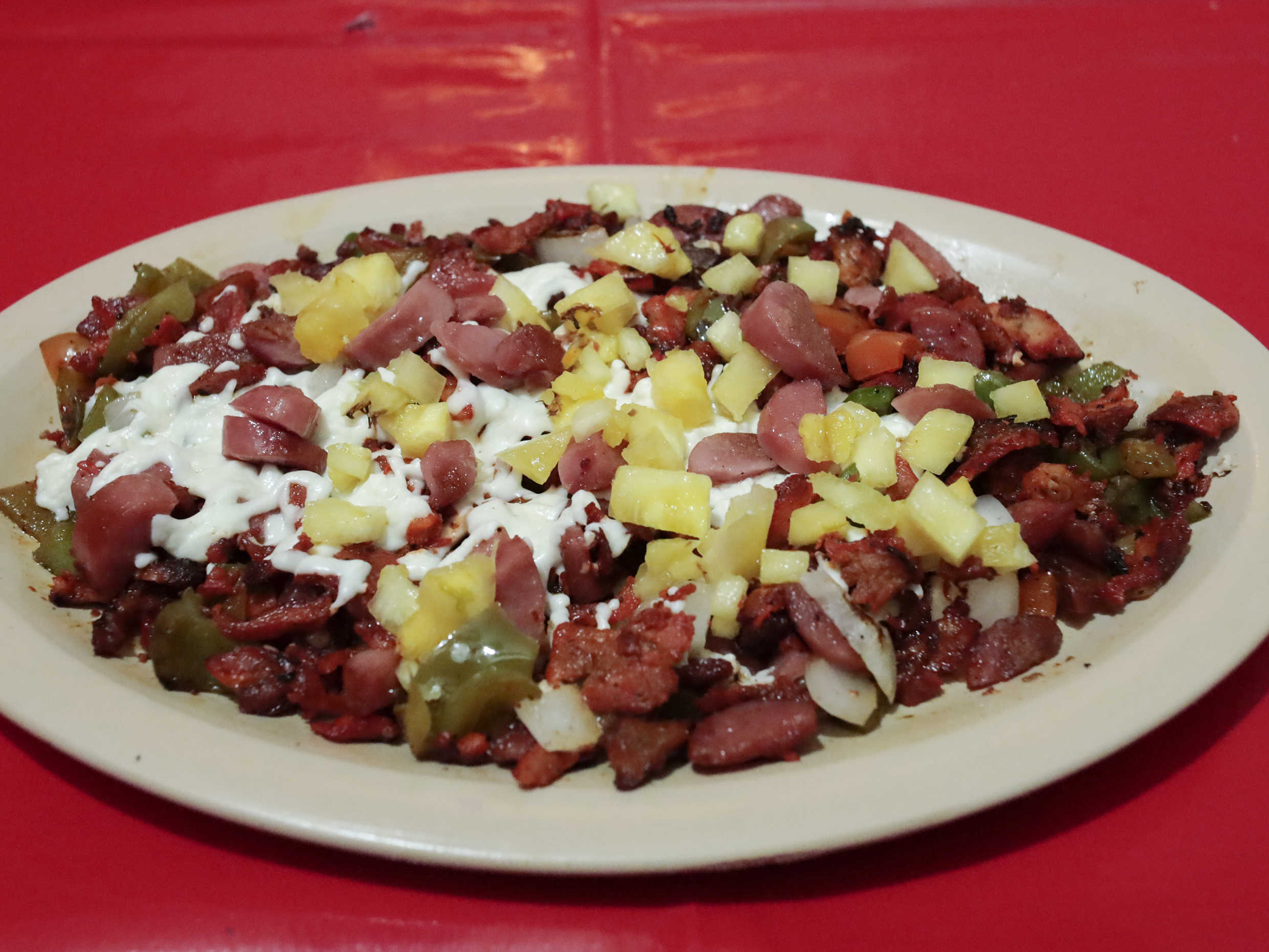 Carne al carbón, longaniza, jamón, salchicha, morrón, cebolla, piña y queso.