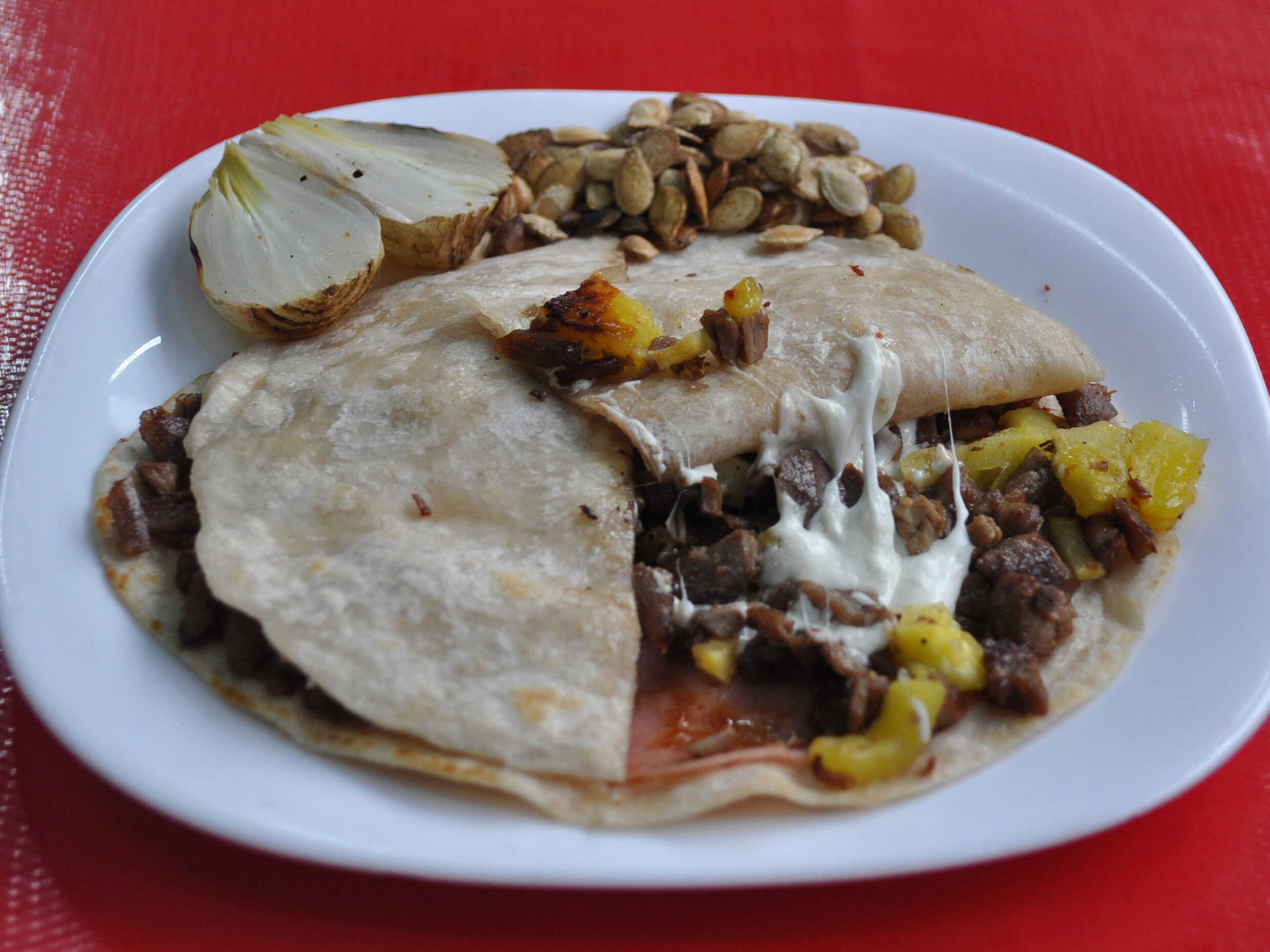 Incluye lechuga, cebolla, chiles en vinagre, jitomate y queso. Arrachera y queso.