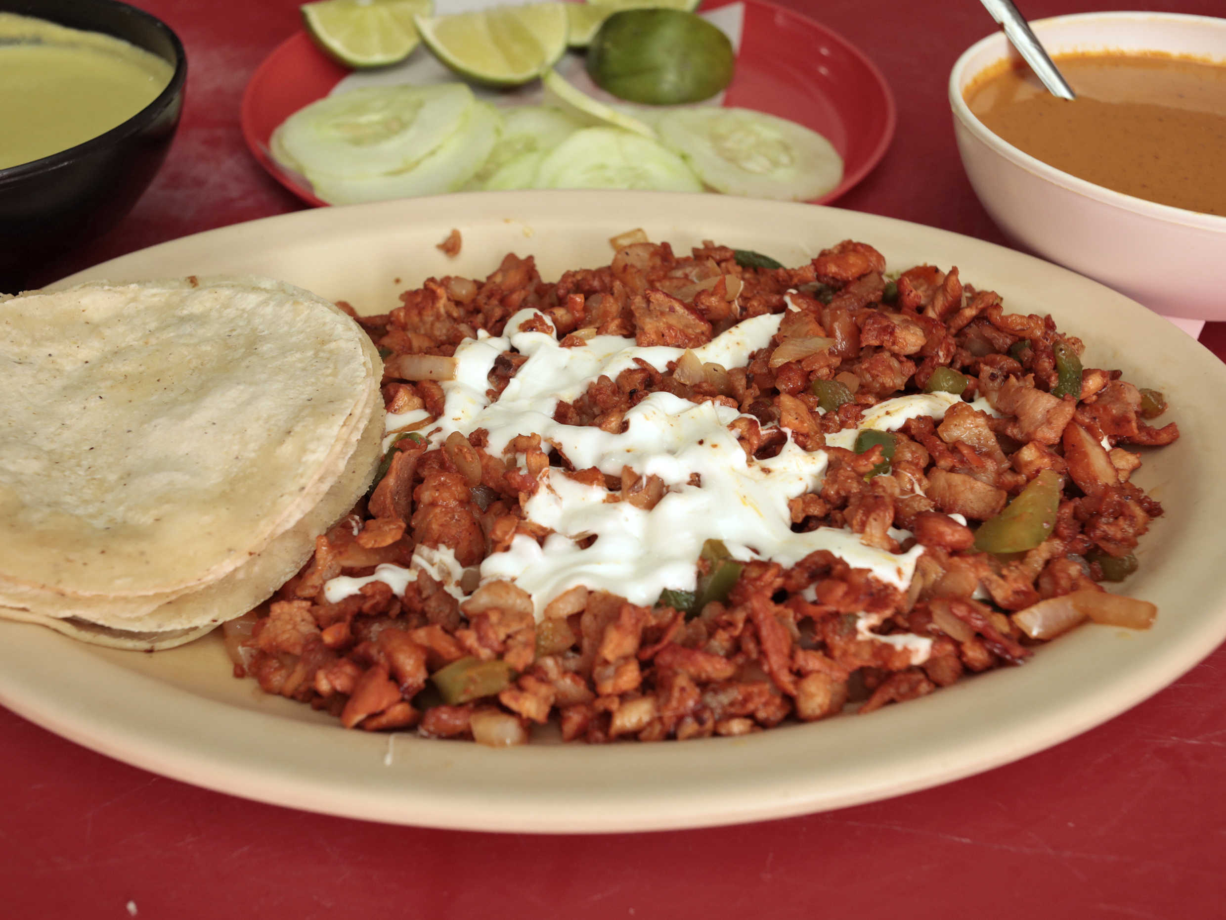 Pastor, bistec, jamón, jitomate, cebolla, morrón y queso oaxaca, ya incluye tortillas.