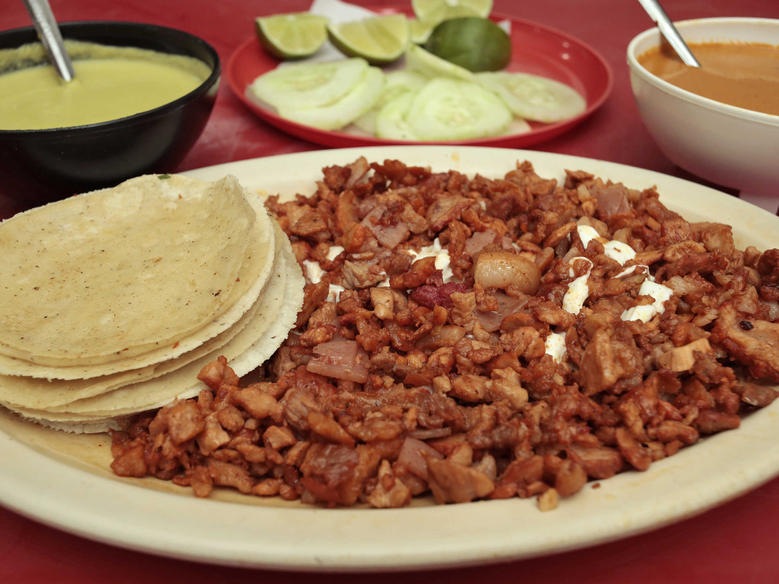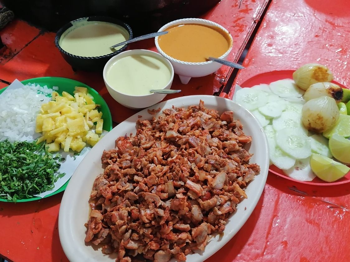 Pastor, chuleta, bistec, piña, jamón y queso oaxaca, ya incluye tortillas.