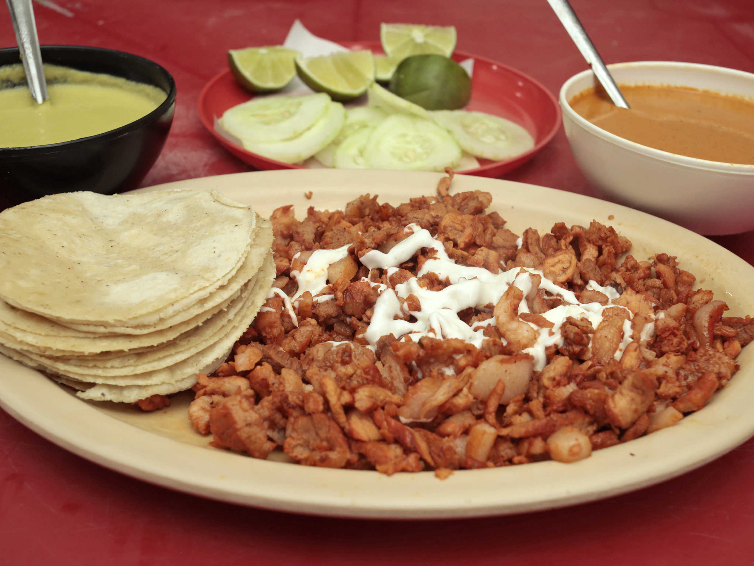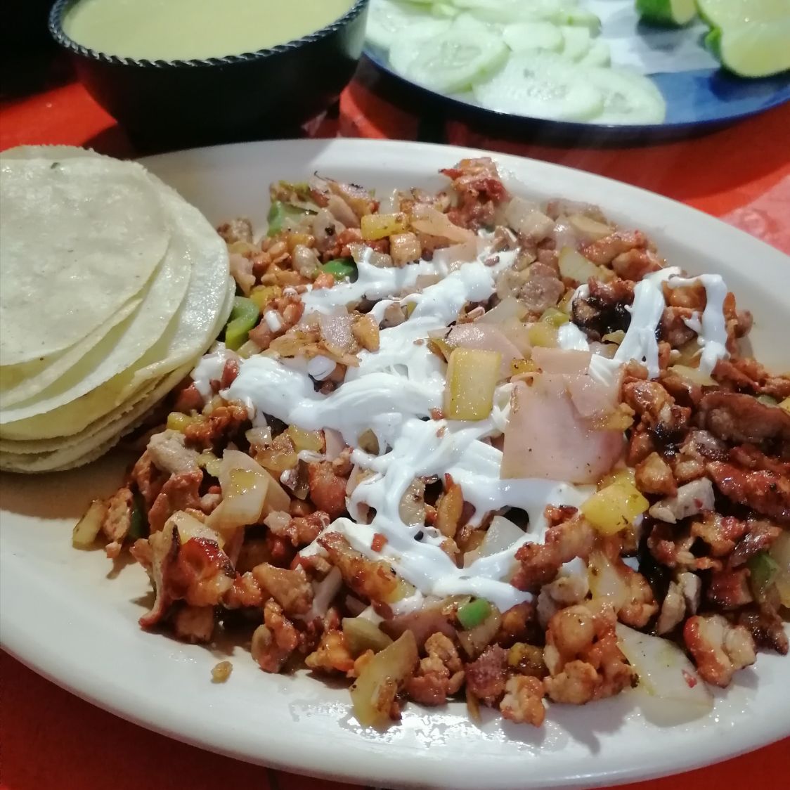 Incluye 1/2 kg de tortillas, cebolla, cilantro, piña, pepinos, limones y las salsas que guste, todo en bolsitas aparte.