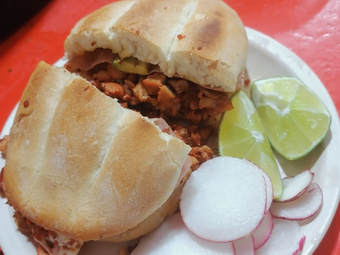 Pastor, chuleta, bistec, longaniza, gratinados con queso oaxaca, jamón, aguacate, mayonesa y frijoles.