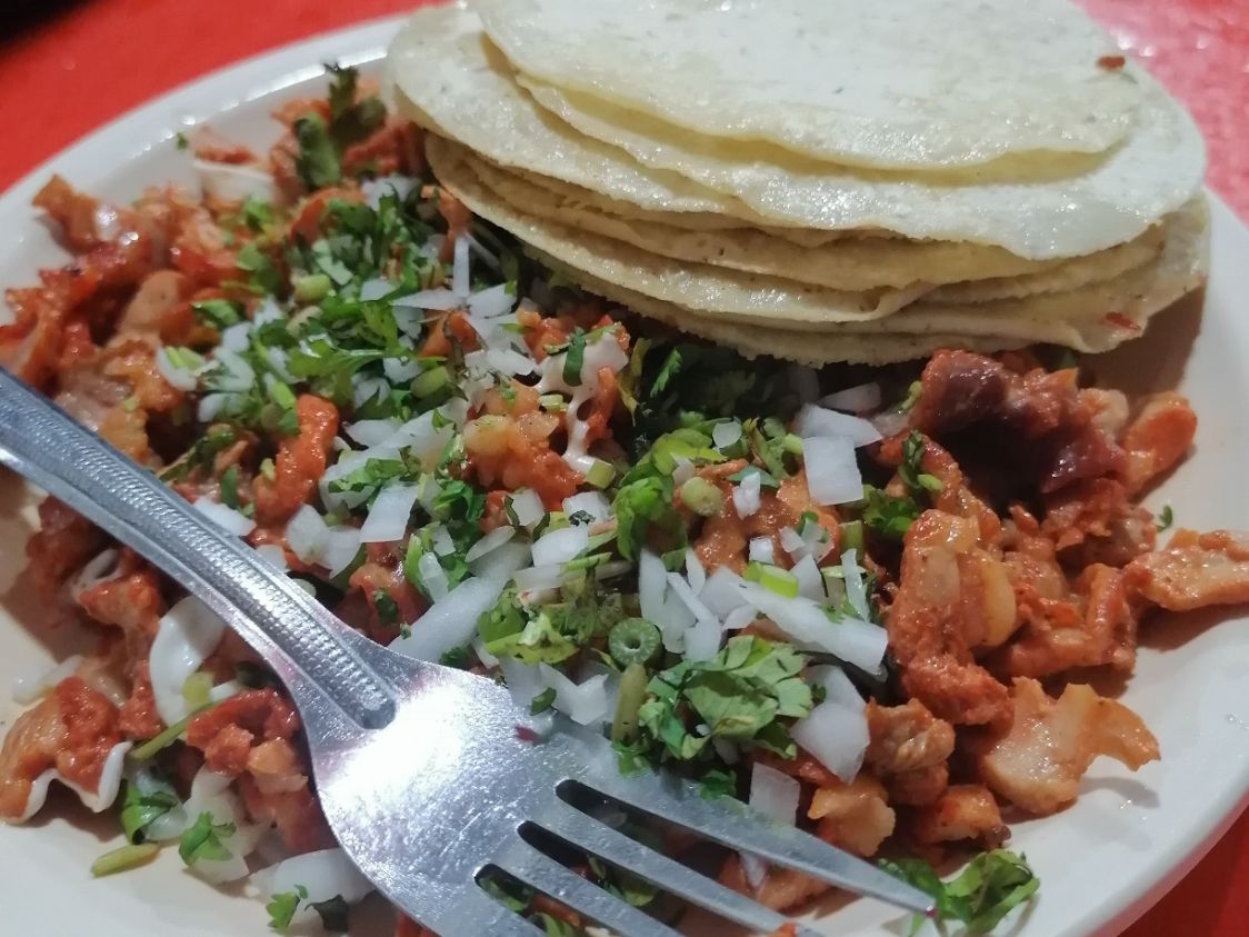 Tortilla de maíz con carne al pastor.