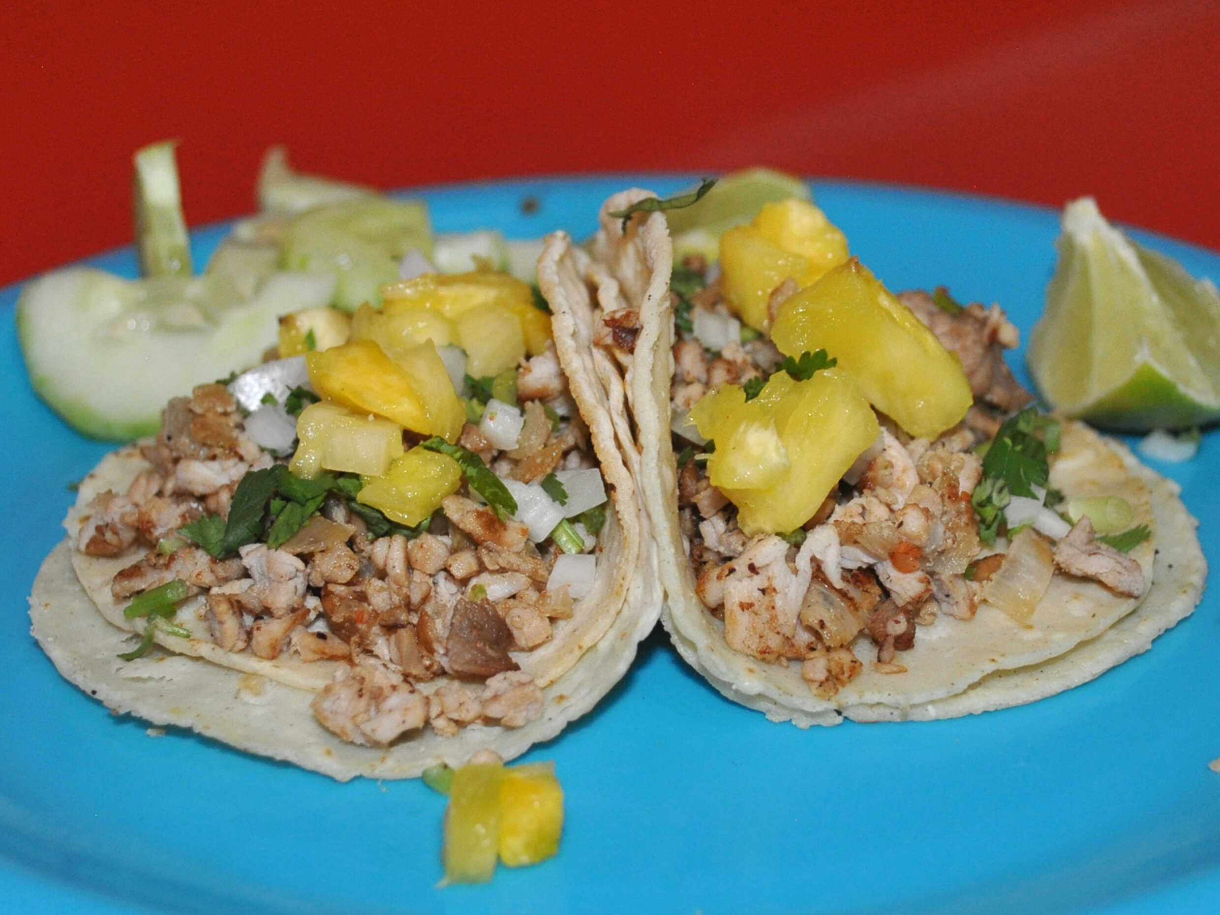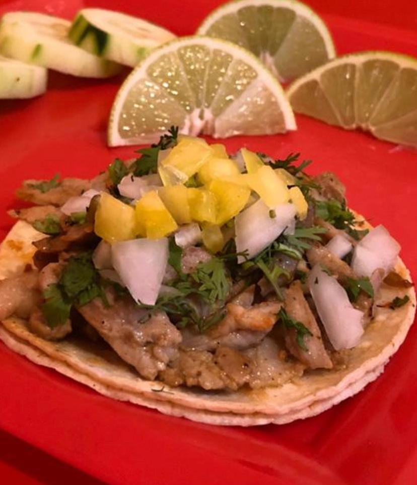 Cebolla, cilantro, piña, limón, salsa verde, y roja