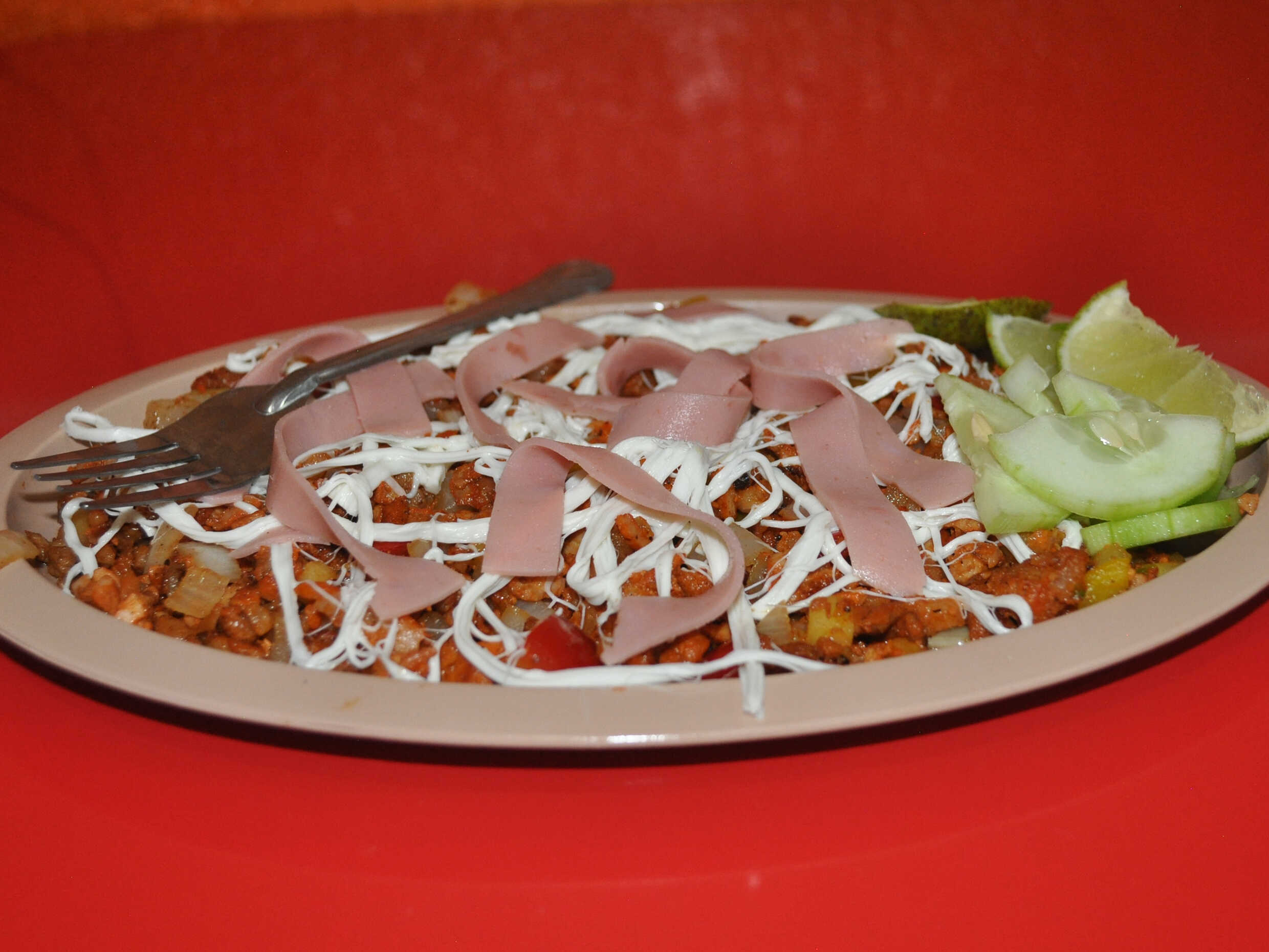 Carne de pastel longaniza bistec morrón cebolla piña jamón y queso 1/4 de tortillas