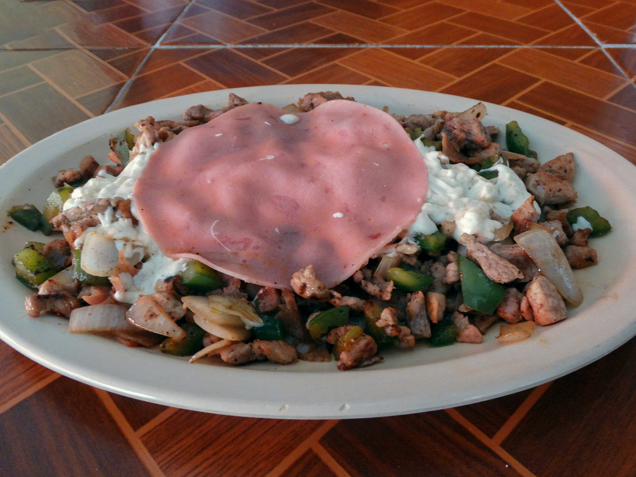 Bistec, jamón, queso amarillo y queso oaxaca.