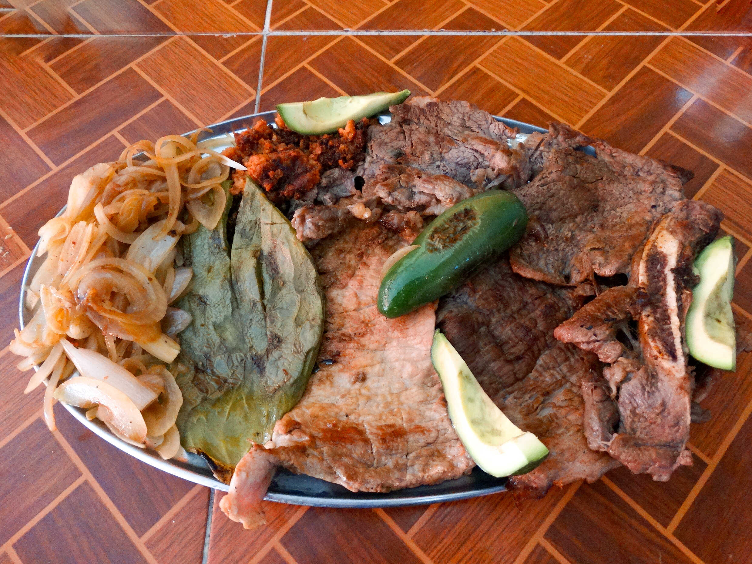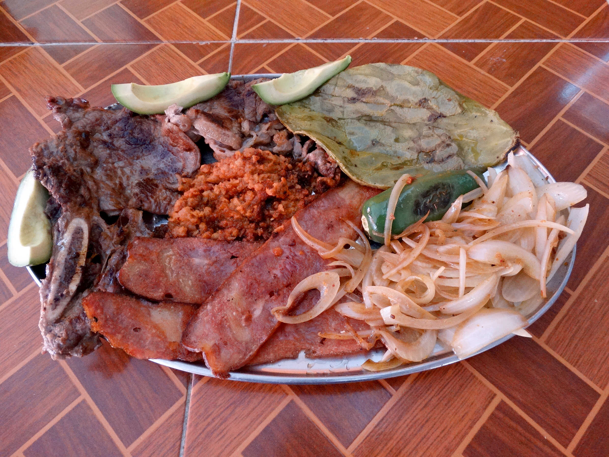 Costilla, chuleta, bistec, longaniza, nopal, cebollita, chile toreado y guacamole.