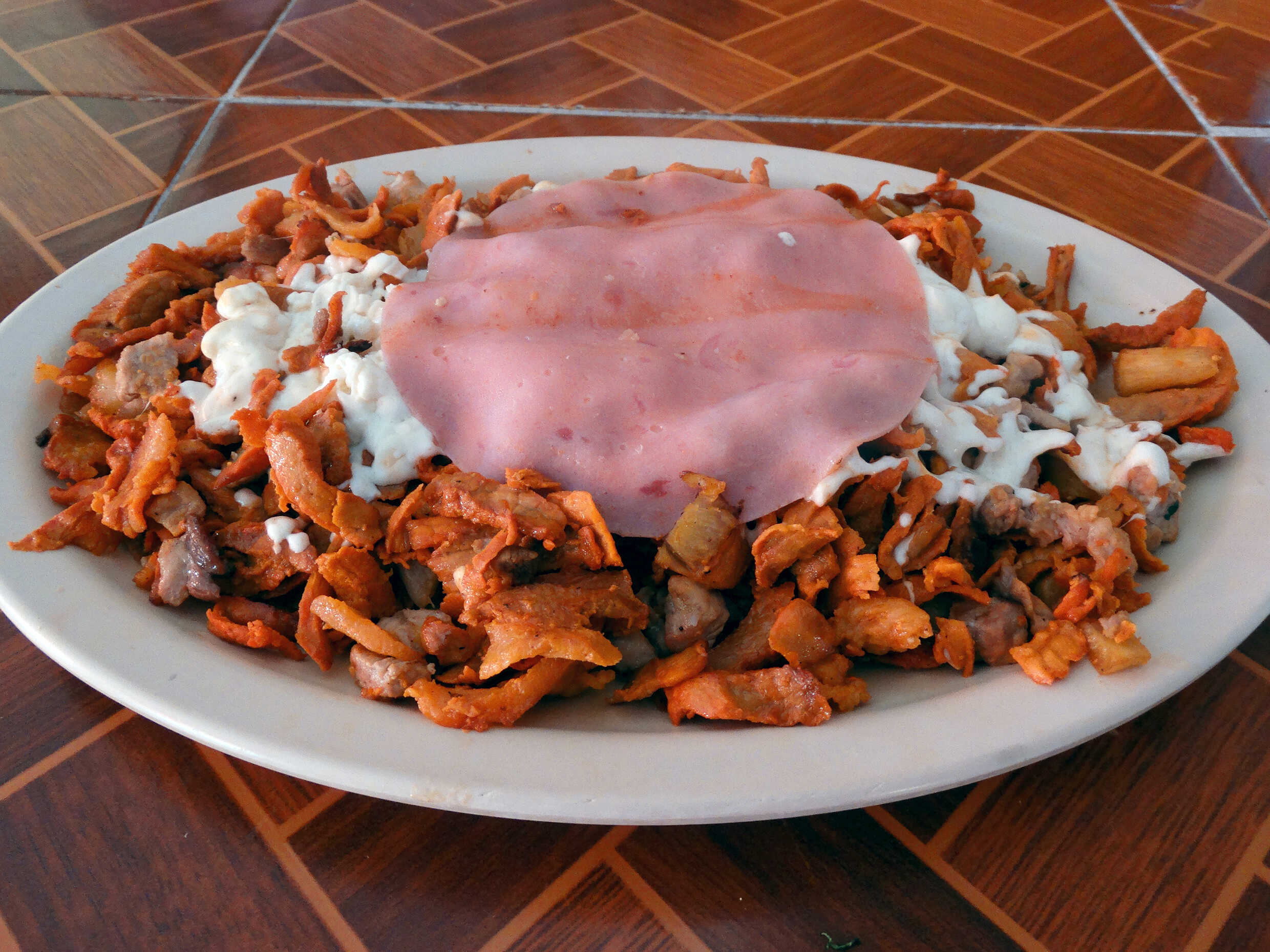 Pastor, salchicha, jamón, queso oaxaca y queso amarillo.