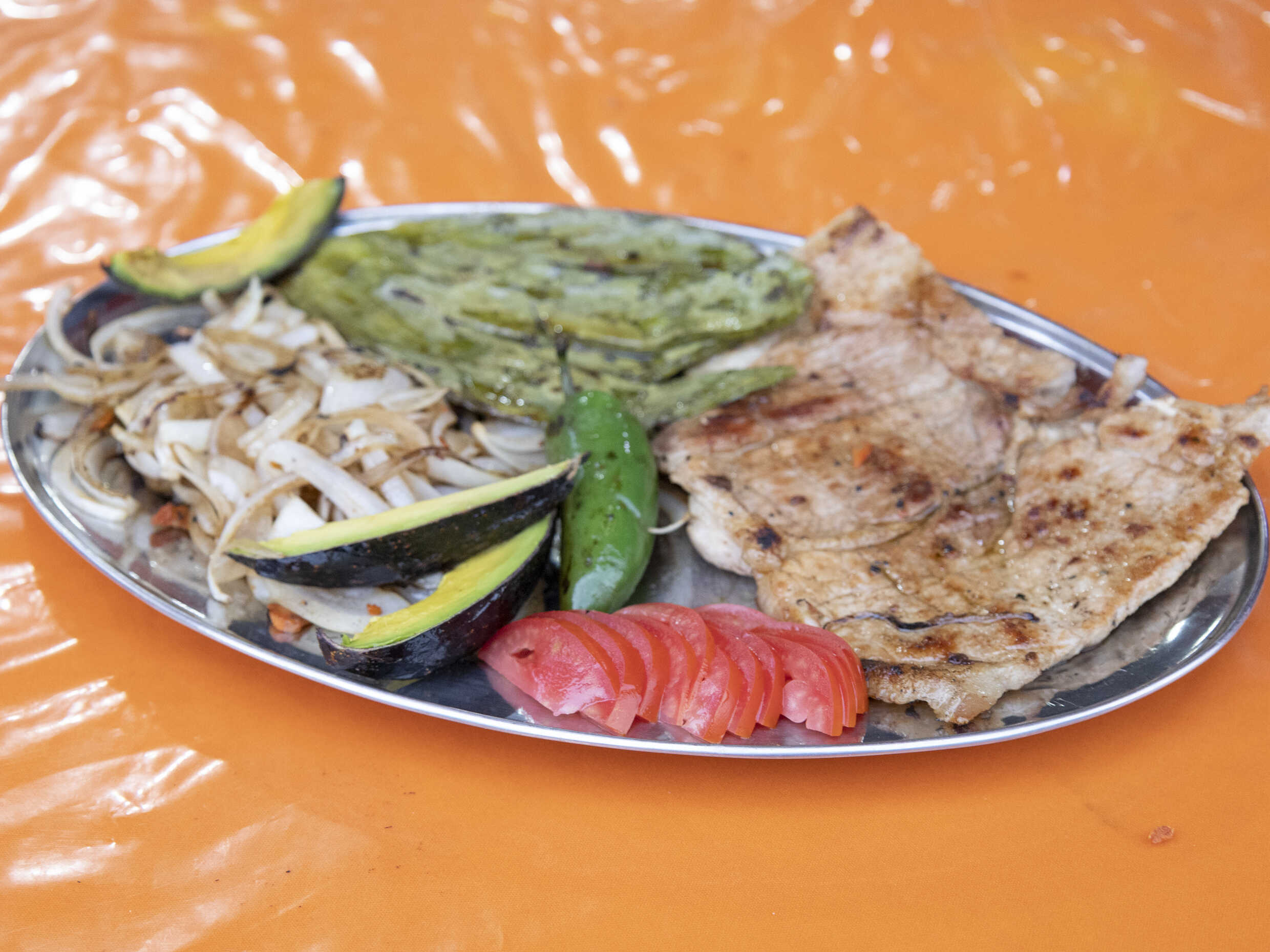 Chuleta, nopal, cebolla, chile toreado, aguacate, jitomate y guacamole.
