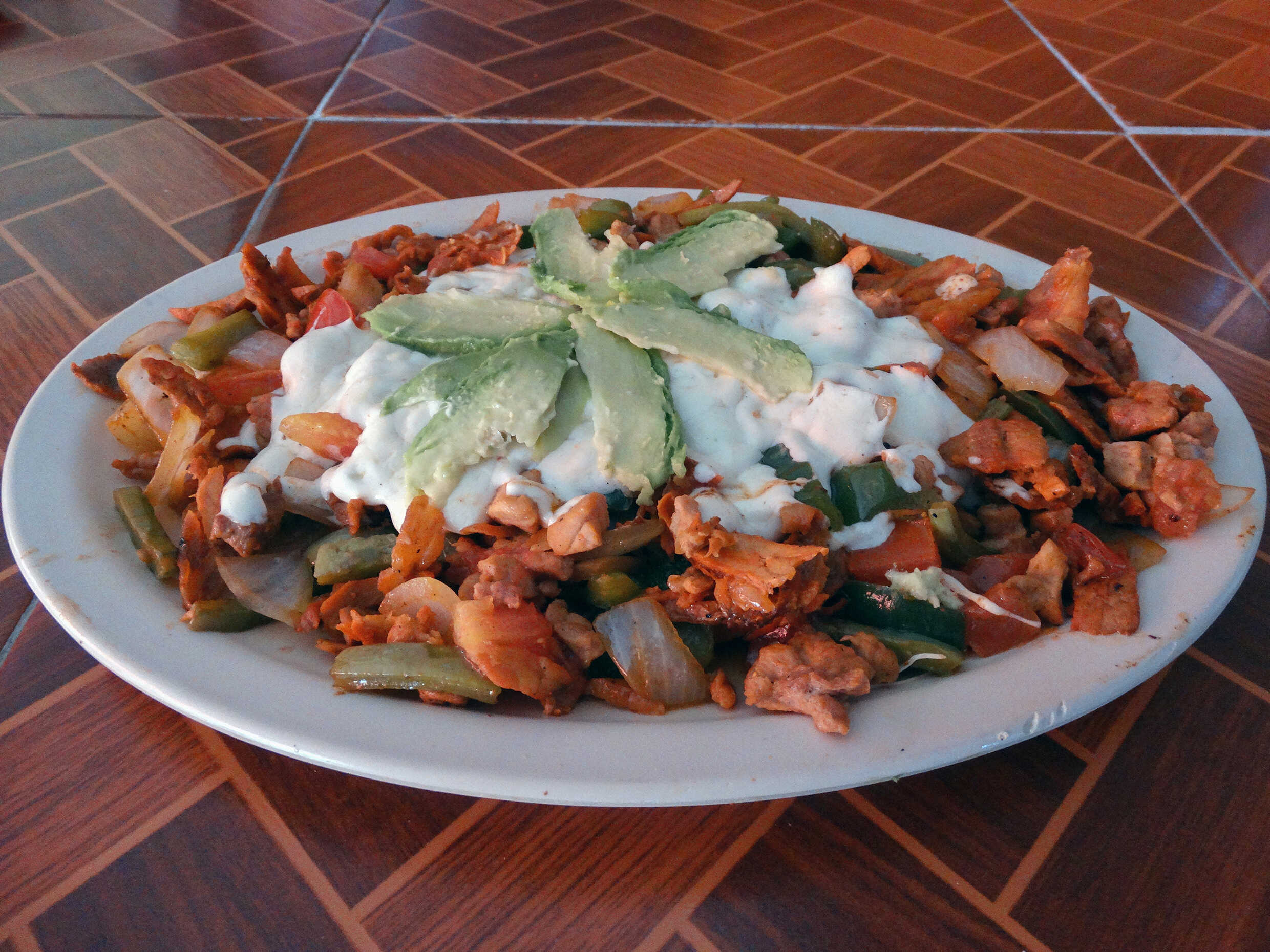 Costilla, tocino, longaniza, nopal, cebollita, chile toreado y aguacate.