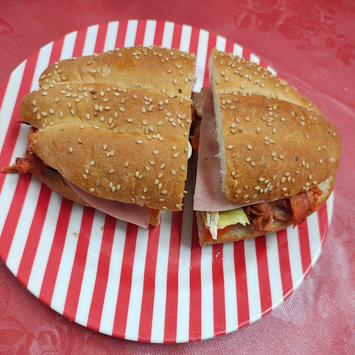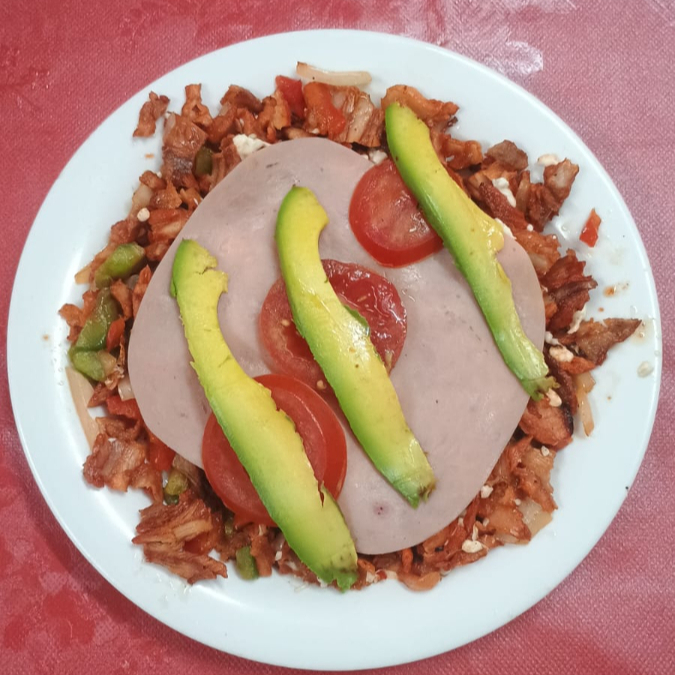 Carne al Pastor, bistec, chuleta, jamón, cebolla, jitomate, aguacate, mayonesa y queso