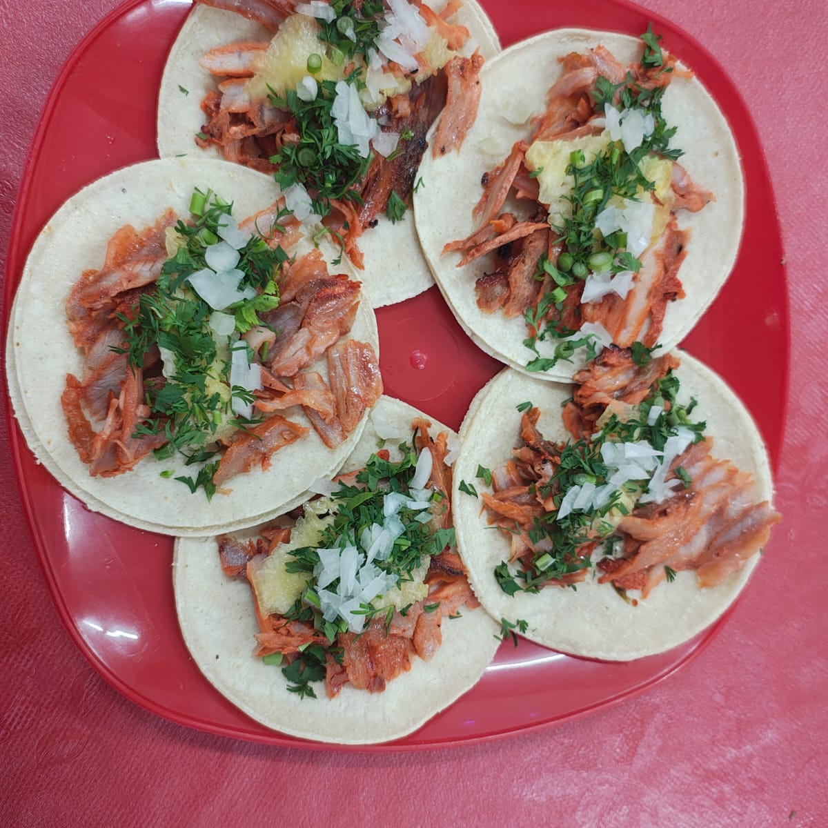 Carne al Pastor, cebolla, jitomate, aguacate, mayonesa y queso.