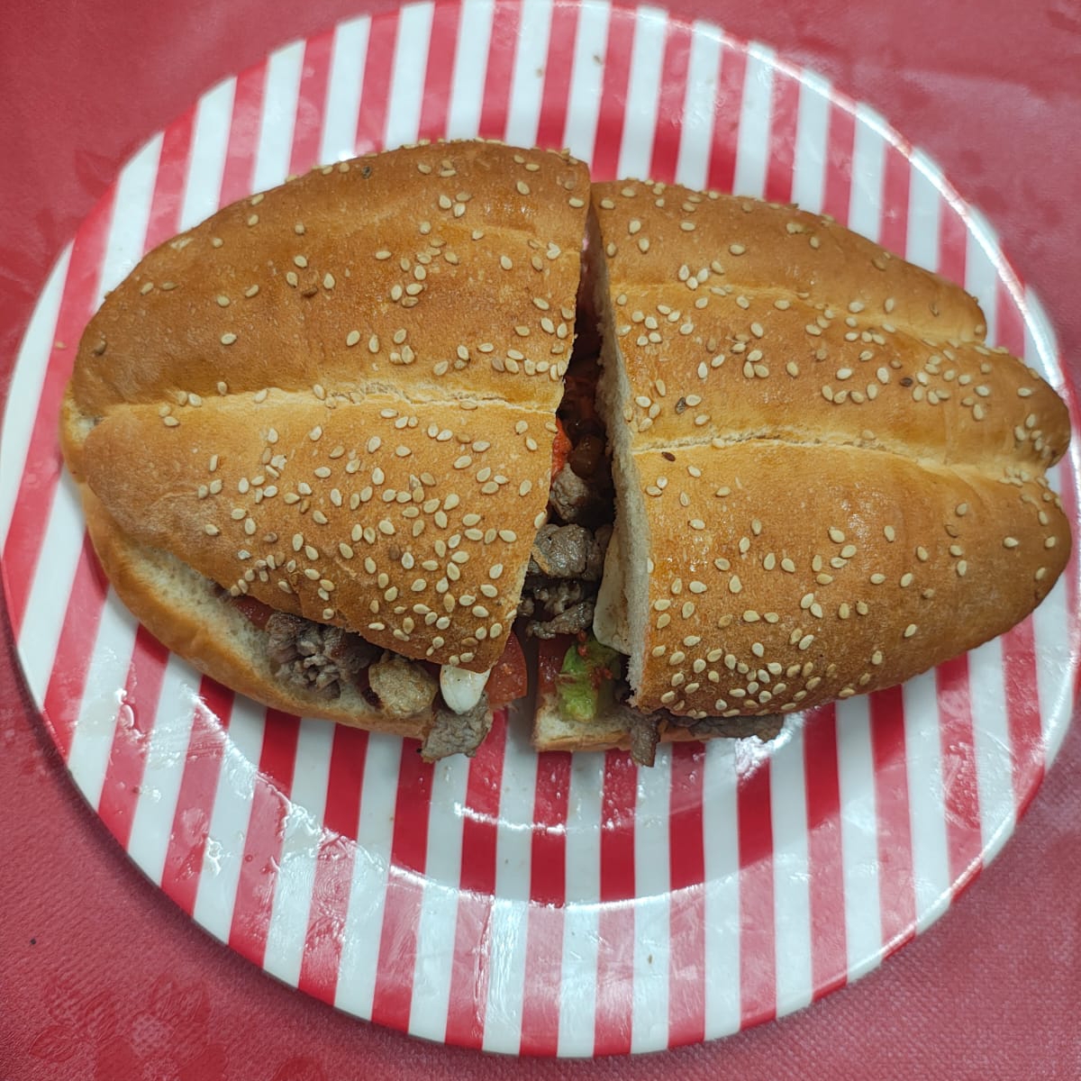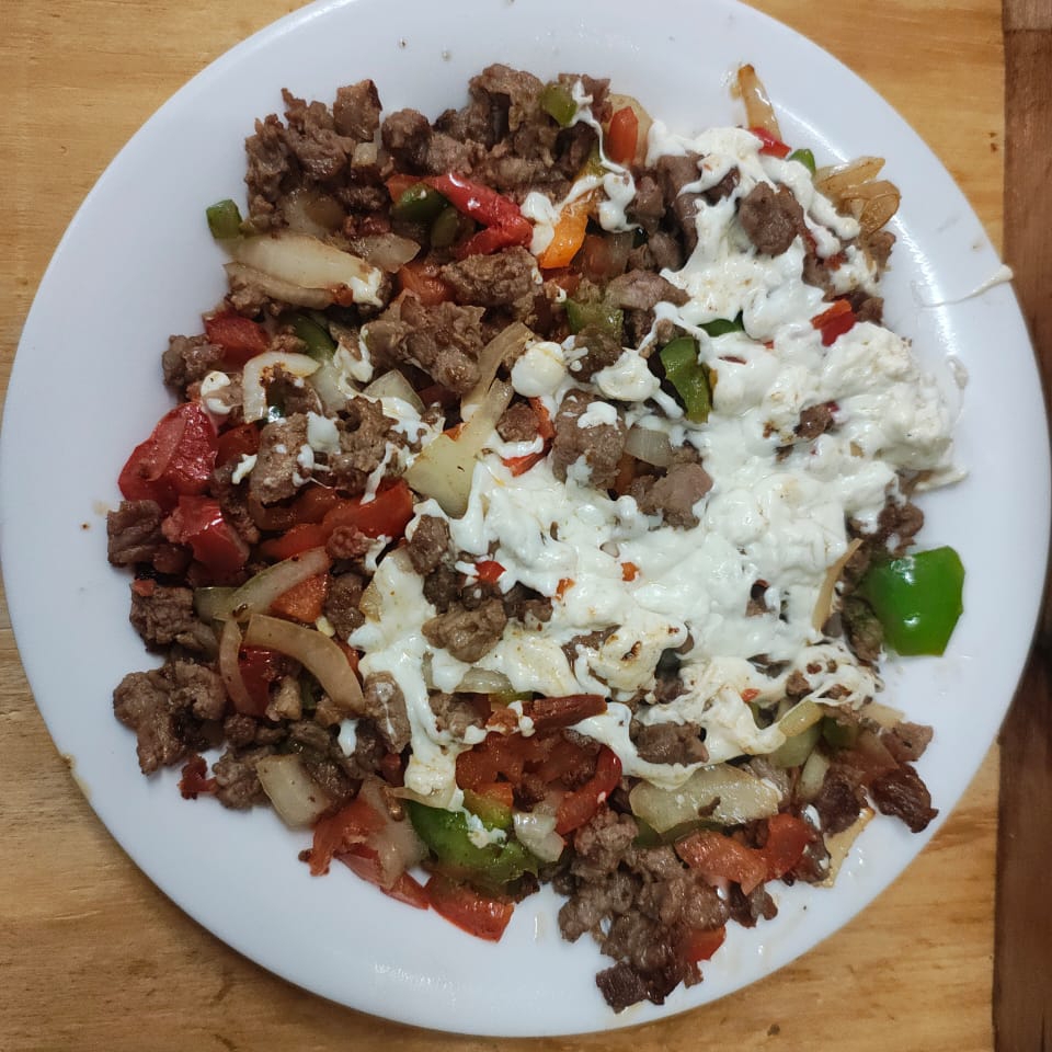 Bistec, cebolla, jitomate, aguacate, mayonesa y queso