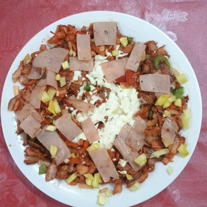 Carne al Pastor, piña, jamón, cebolla, jitomate, aguacate, mayonesa y queso.