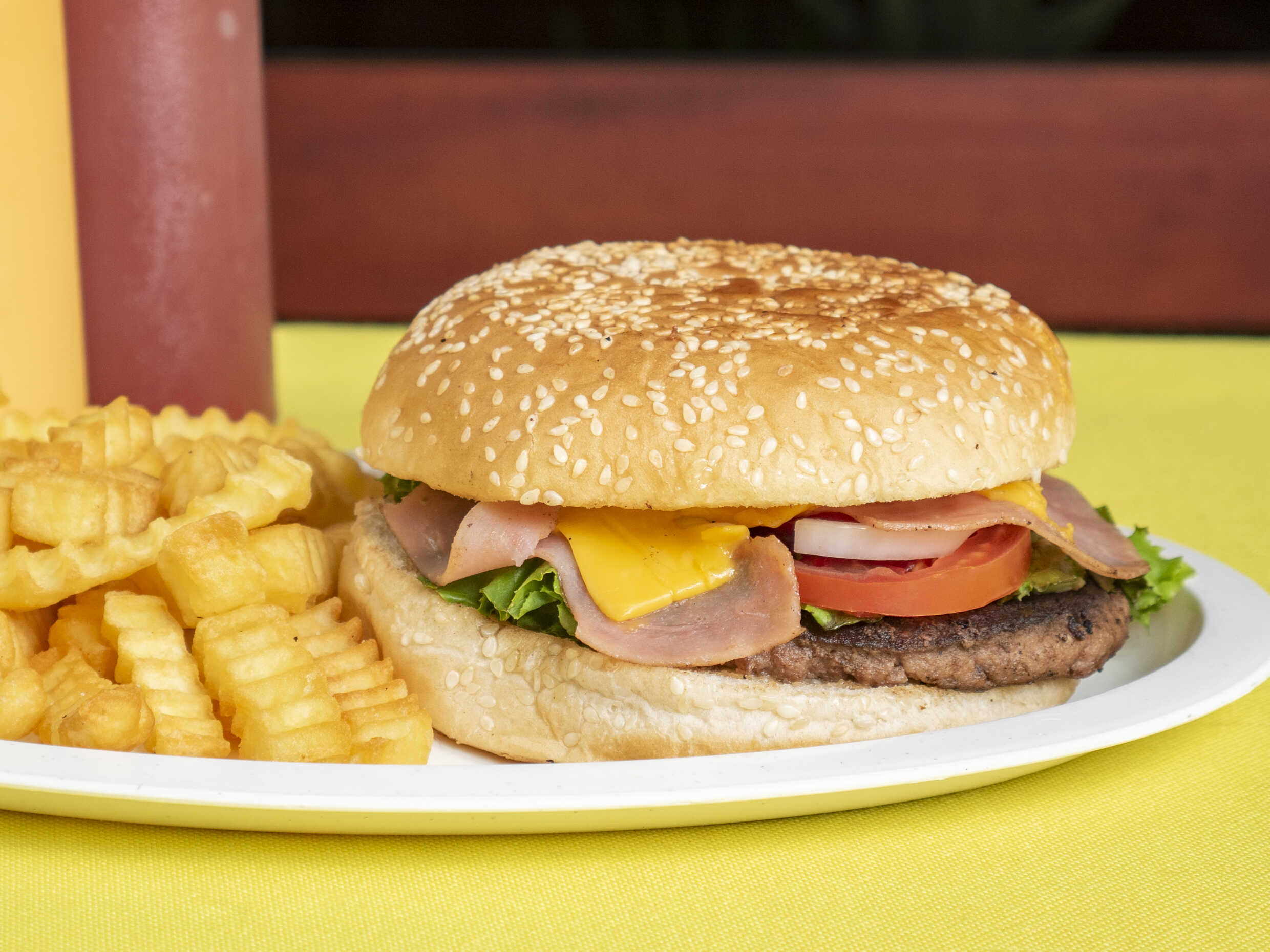 Carne al carbón, chuleta, tocino, morrón, cebolla, piña, jamón, aguacate y queso.