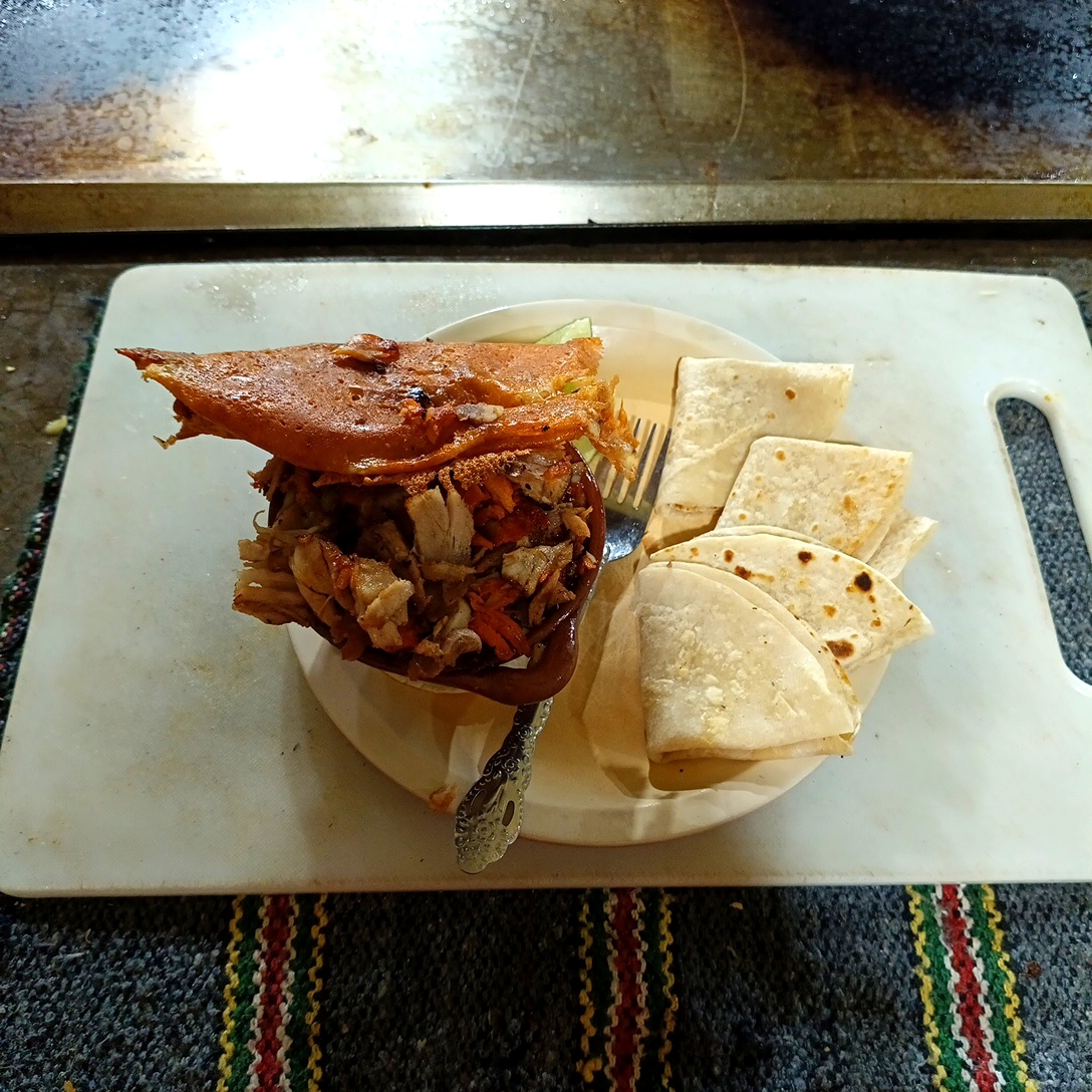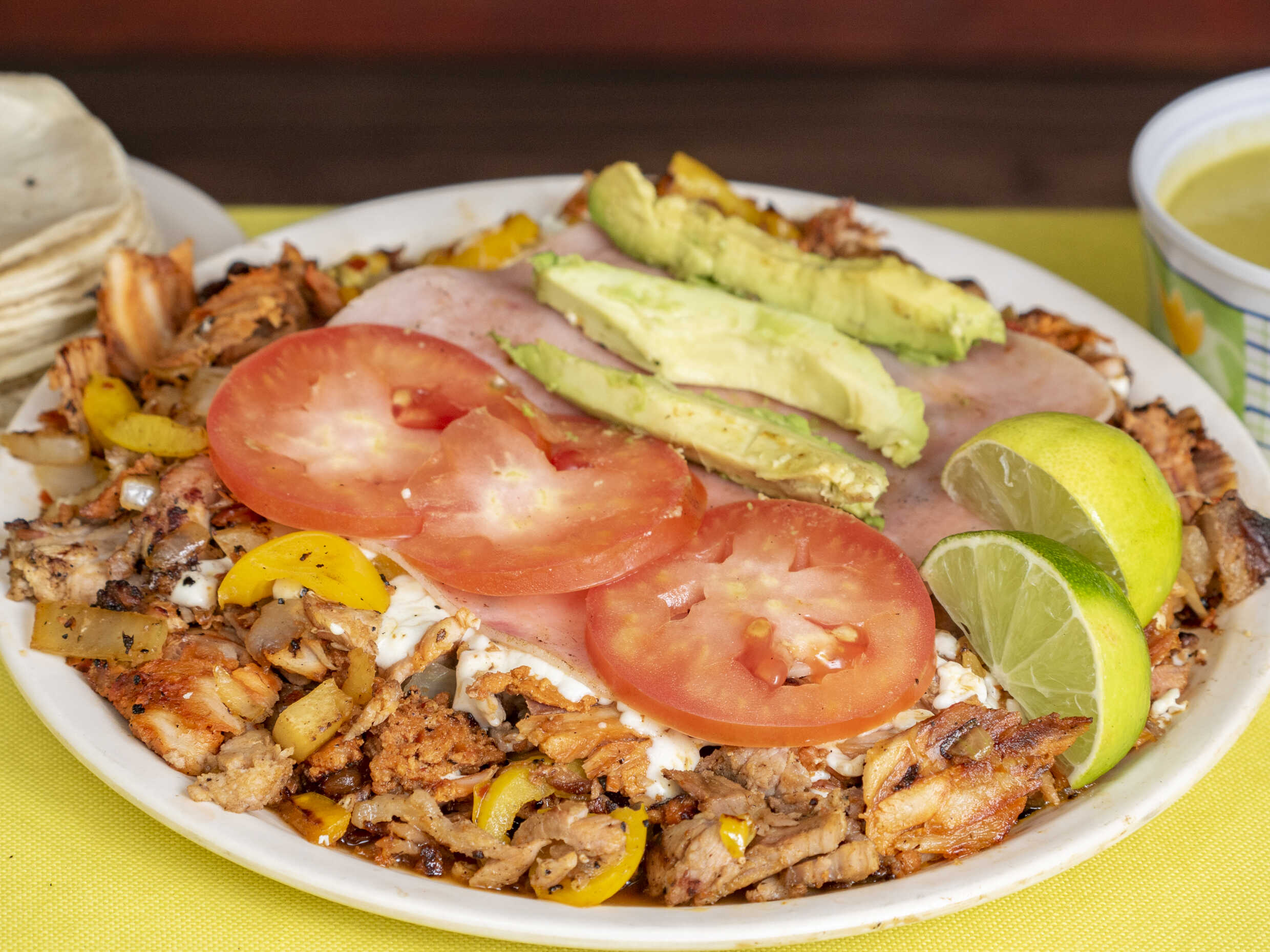 Para una persona, cebolla, jitomate, aguacate, queso mayonesa y carne pastor.