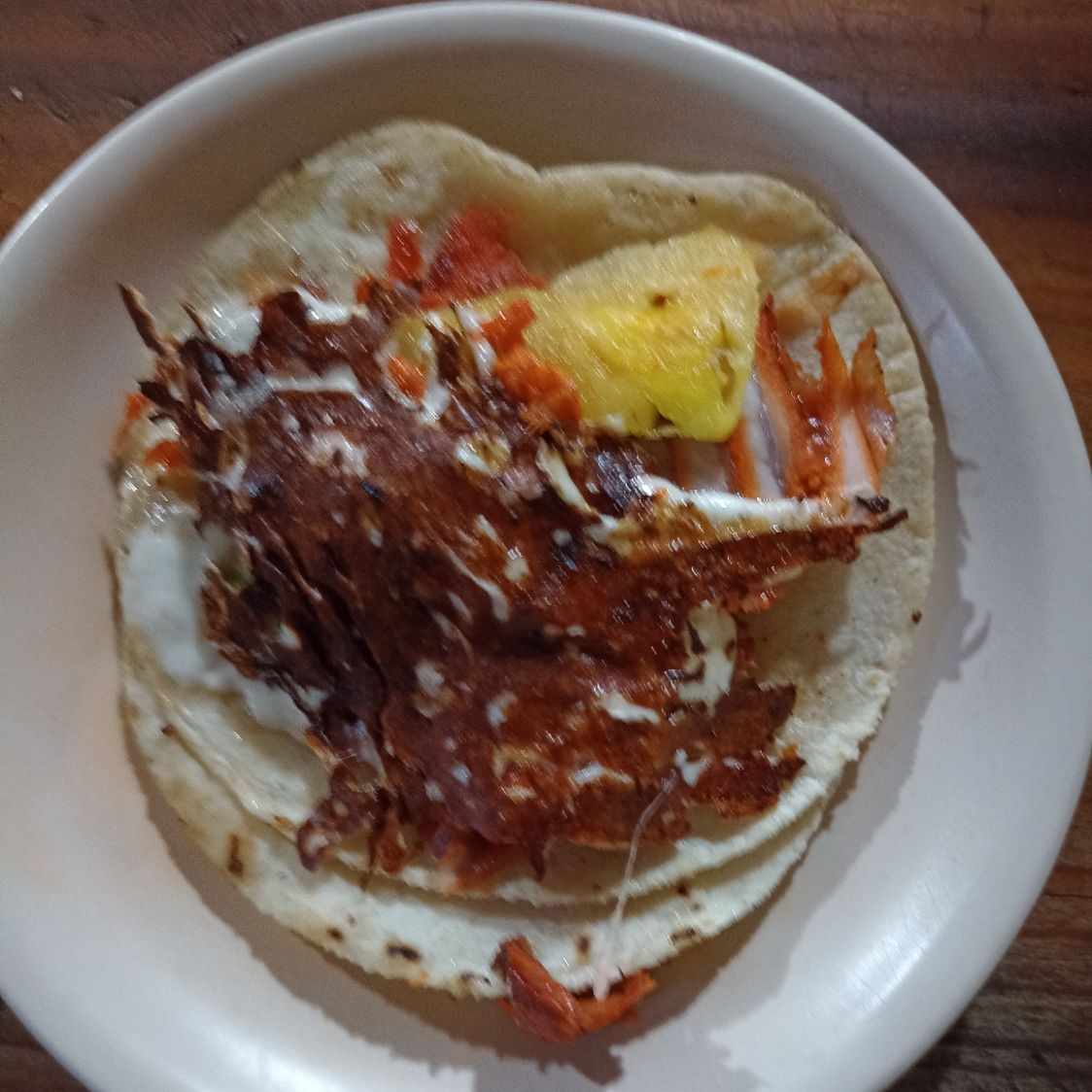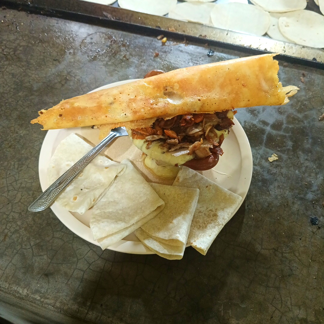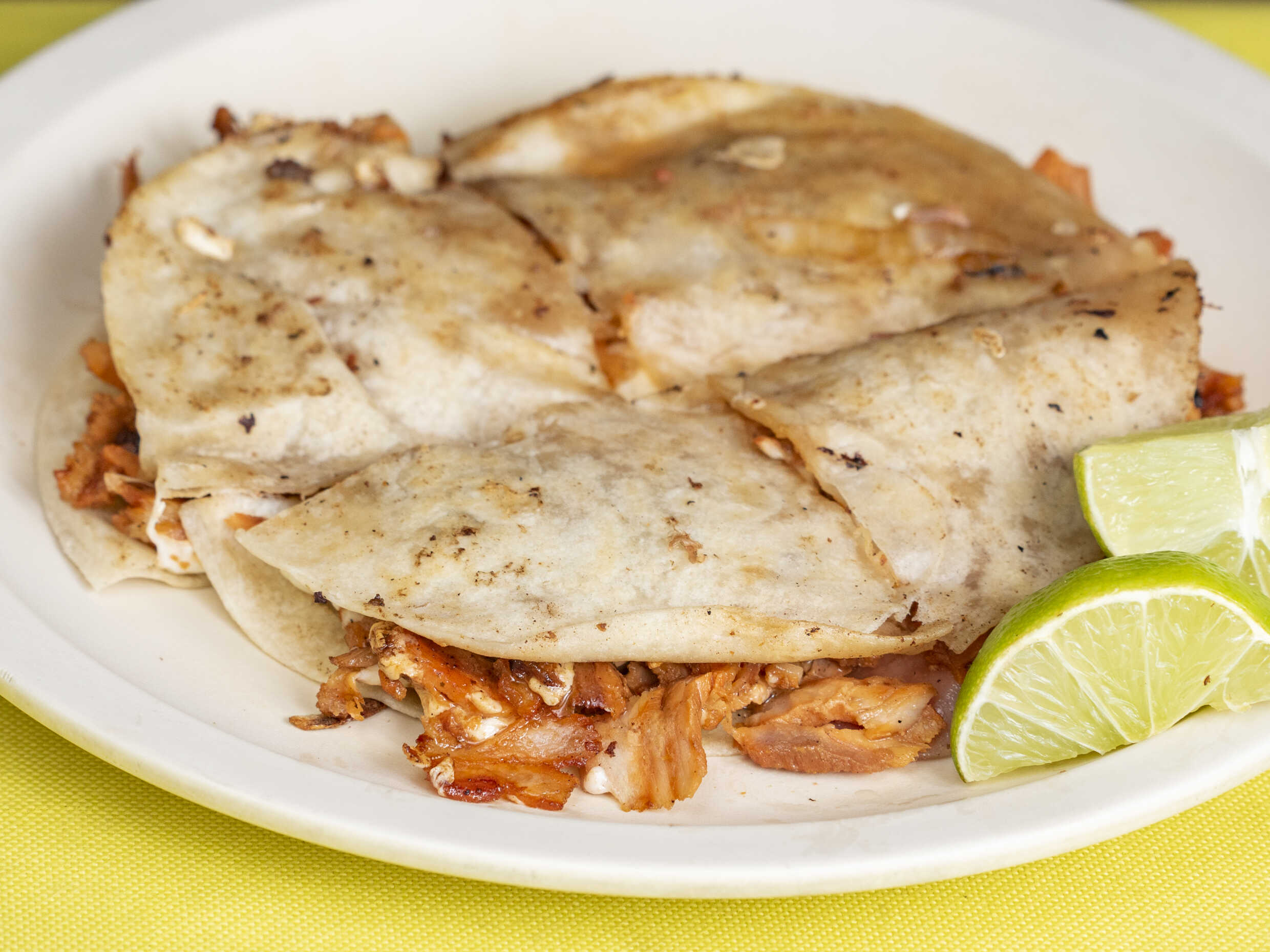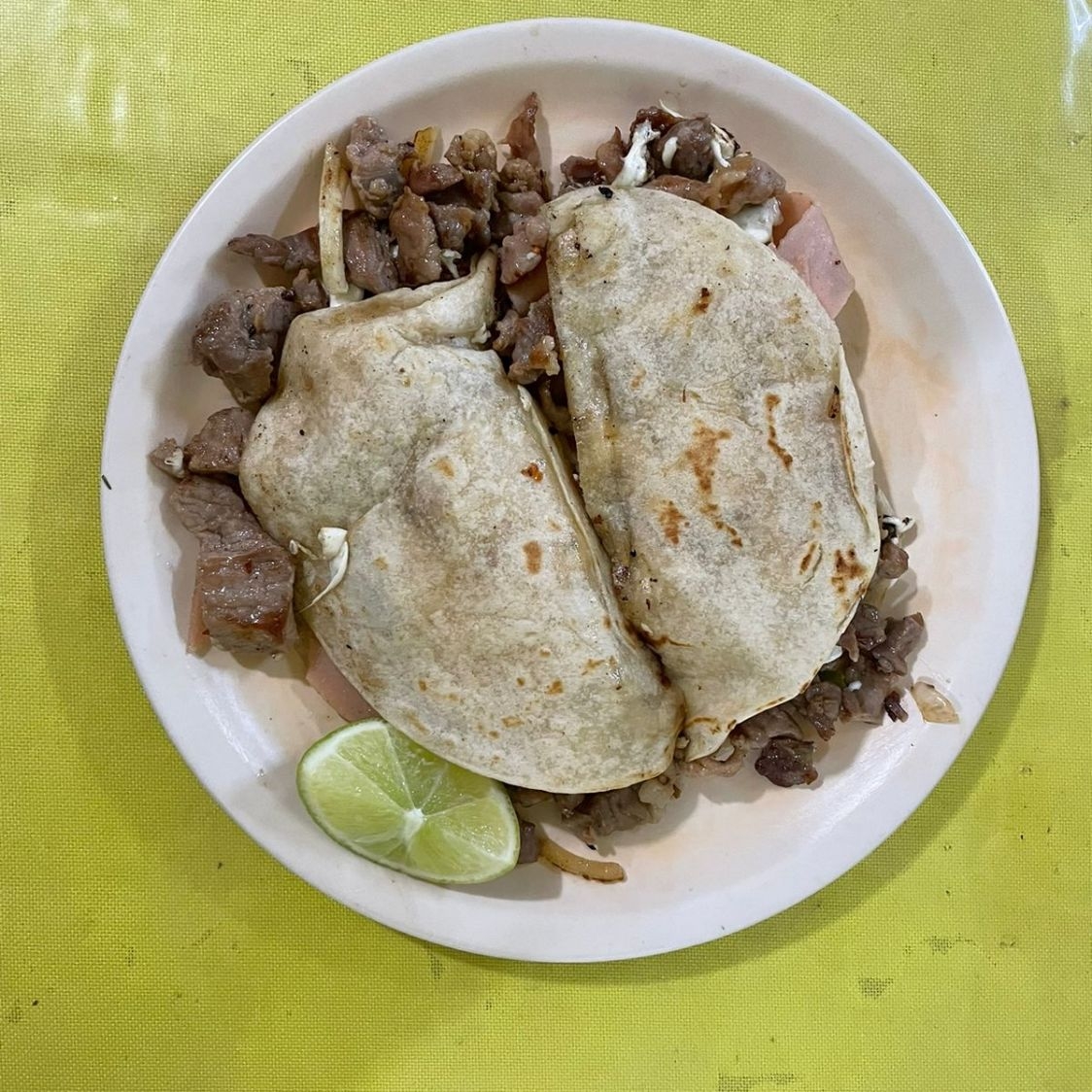 2 Tortillas de harina, carne al pastor, o al carbón o mixta, jamón, queso y queso amarillo.