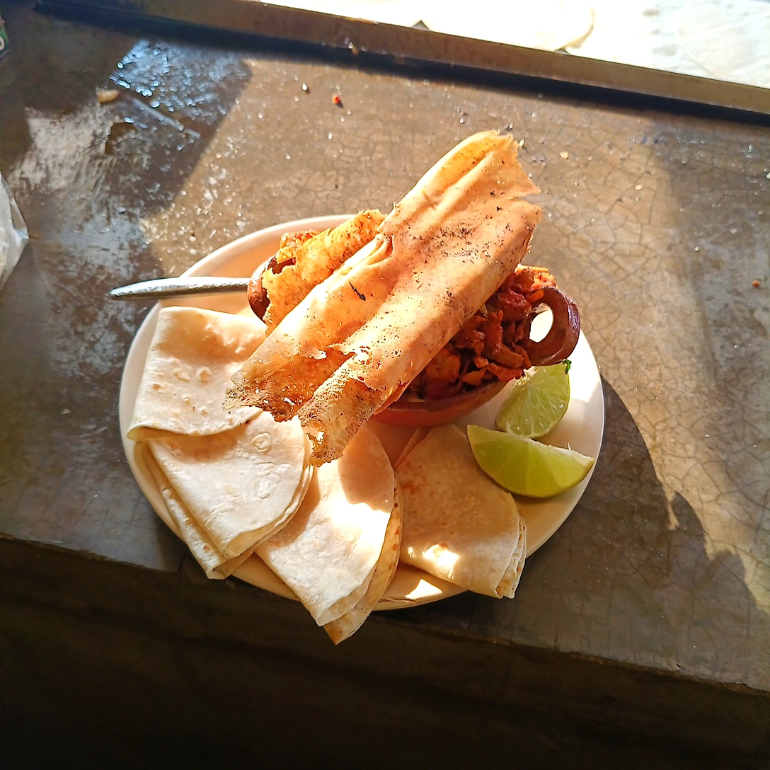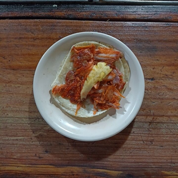 Cebolla, jitomate, aguacate, queso, mayonesa y carne pastor.