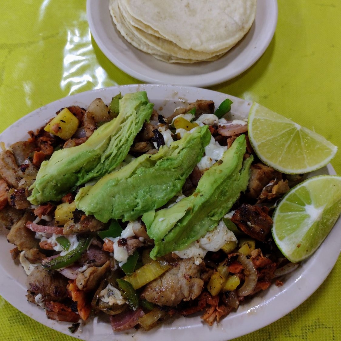 Carne al pastor, al carbón, milanesa, cebolla, aguacate, jitomate y queso y queso.