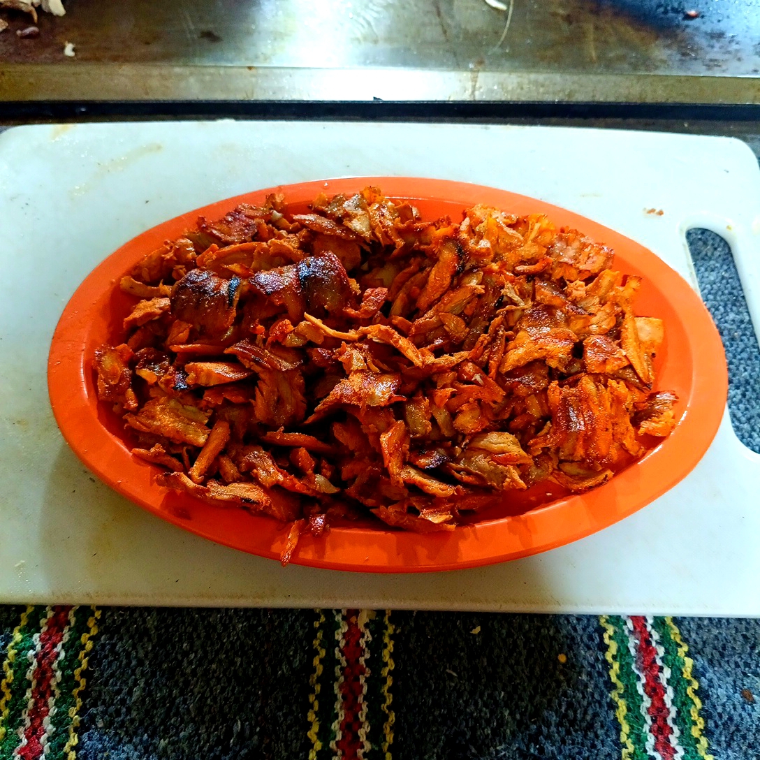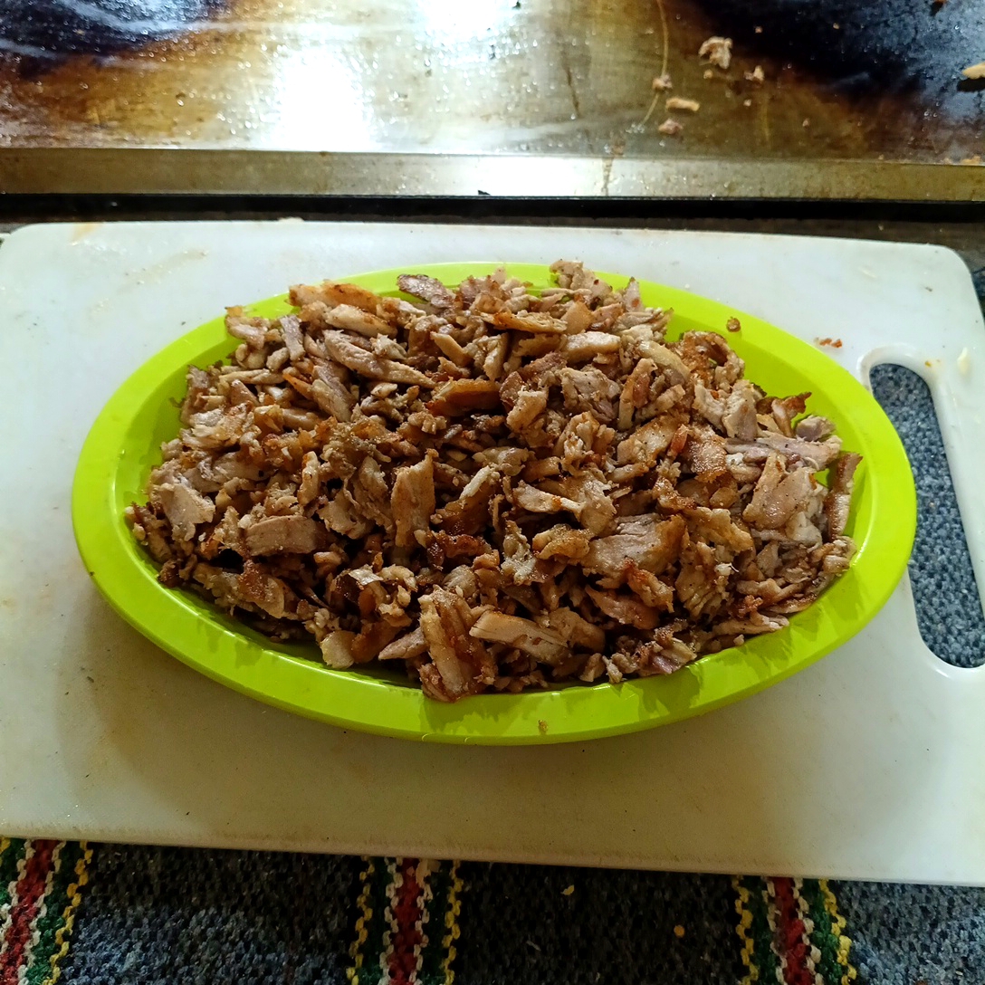 Carne al pastor y carbón, cebolla, morrón con queso.