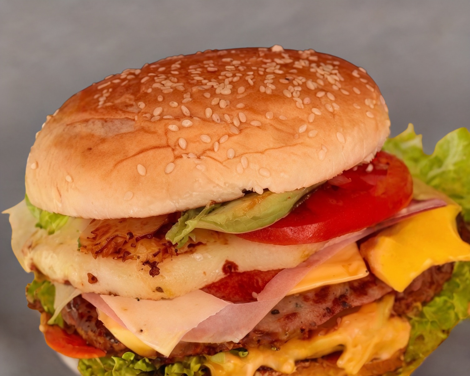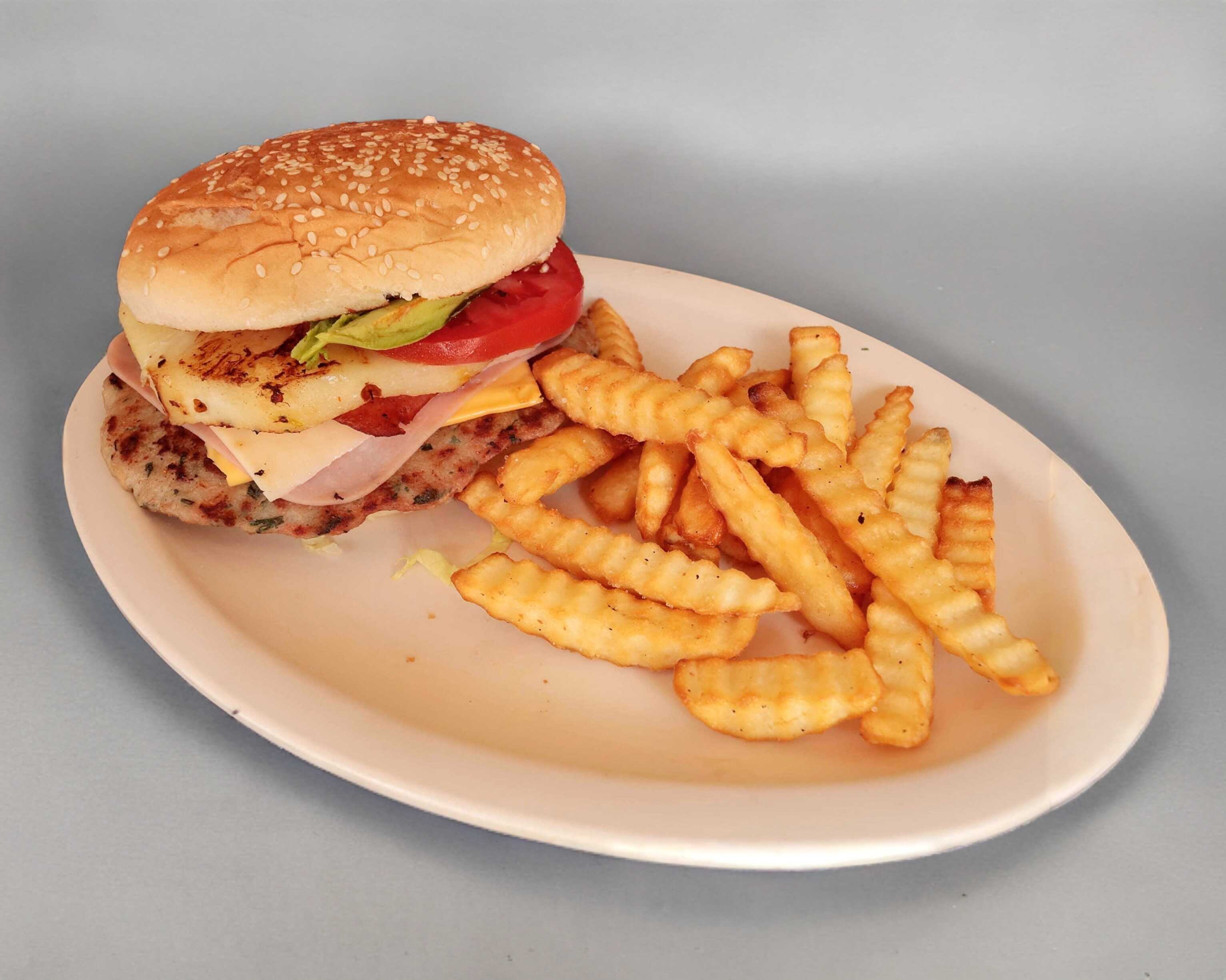 Lechuga, doble carne, queso, jamón, piña y aderezo.