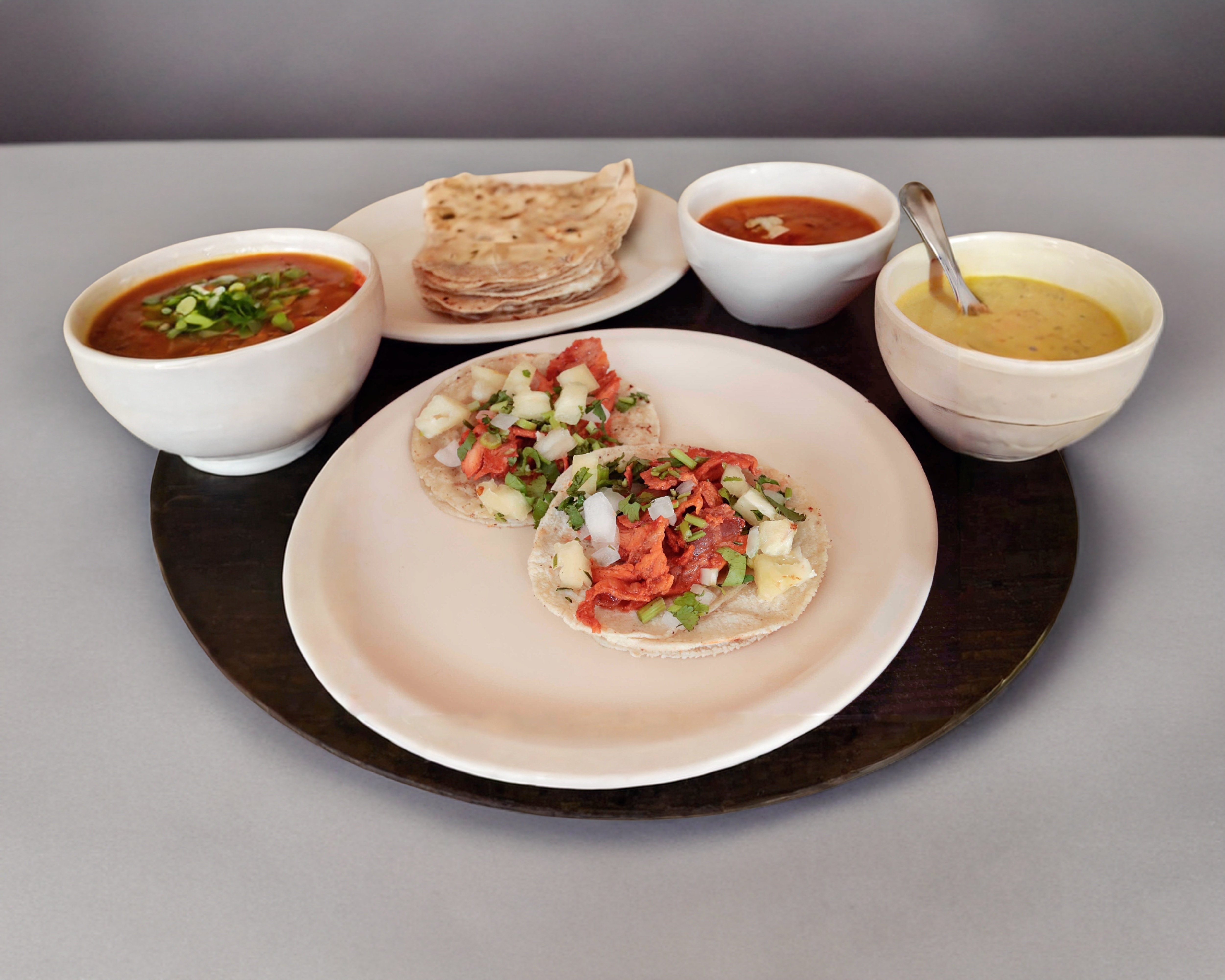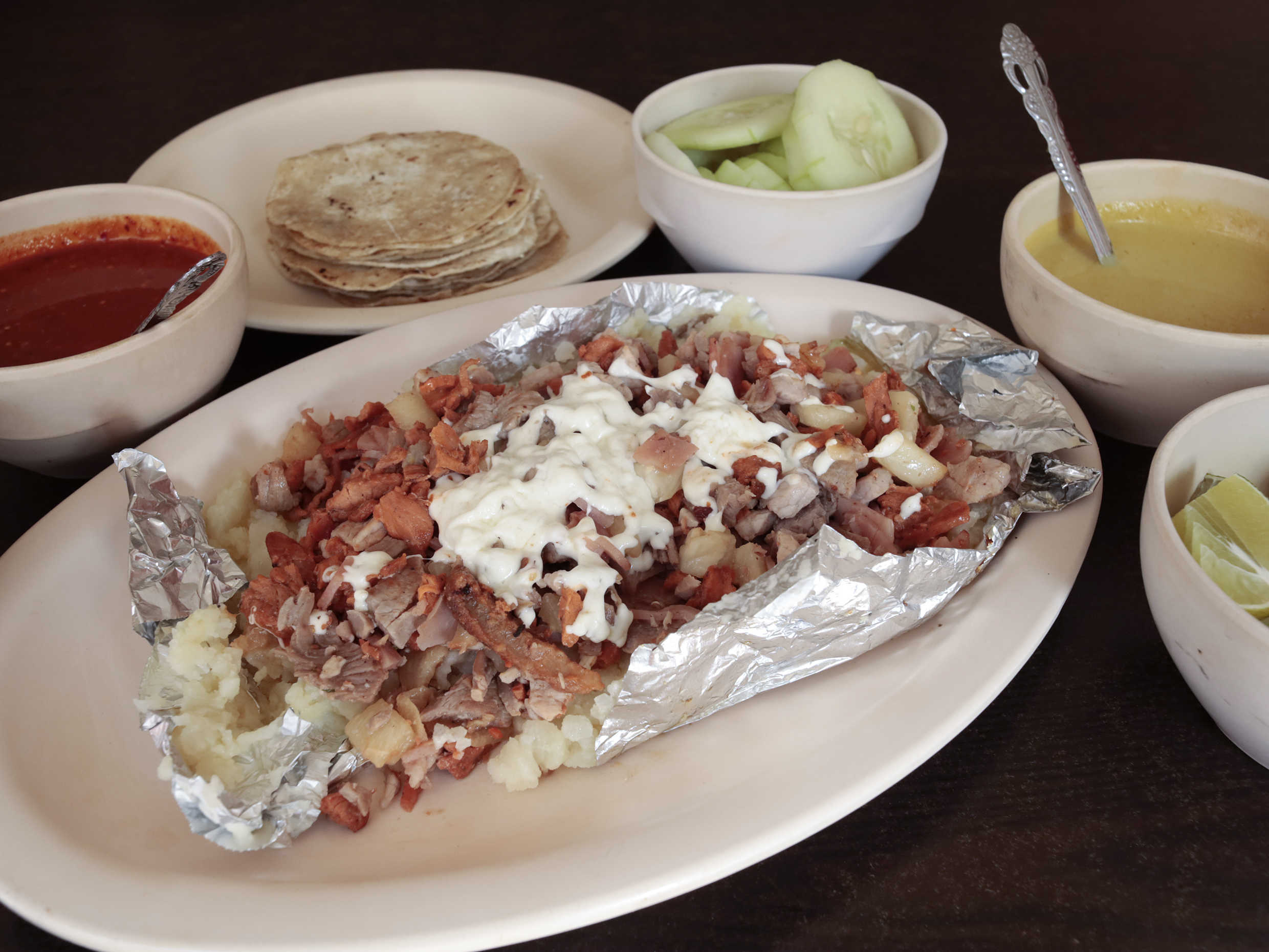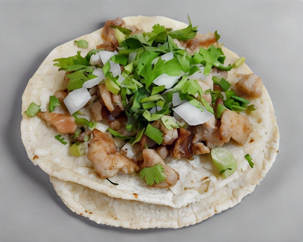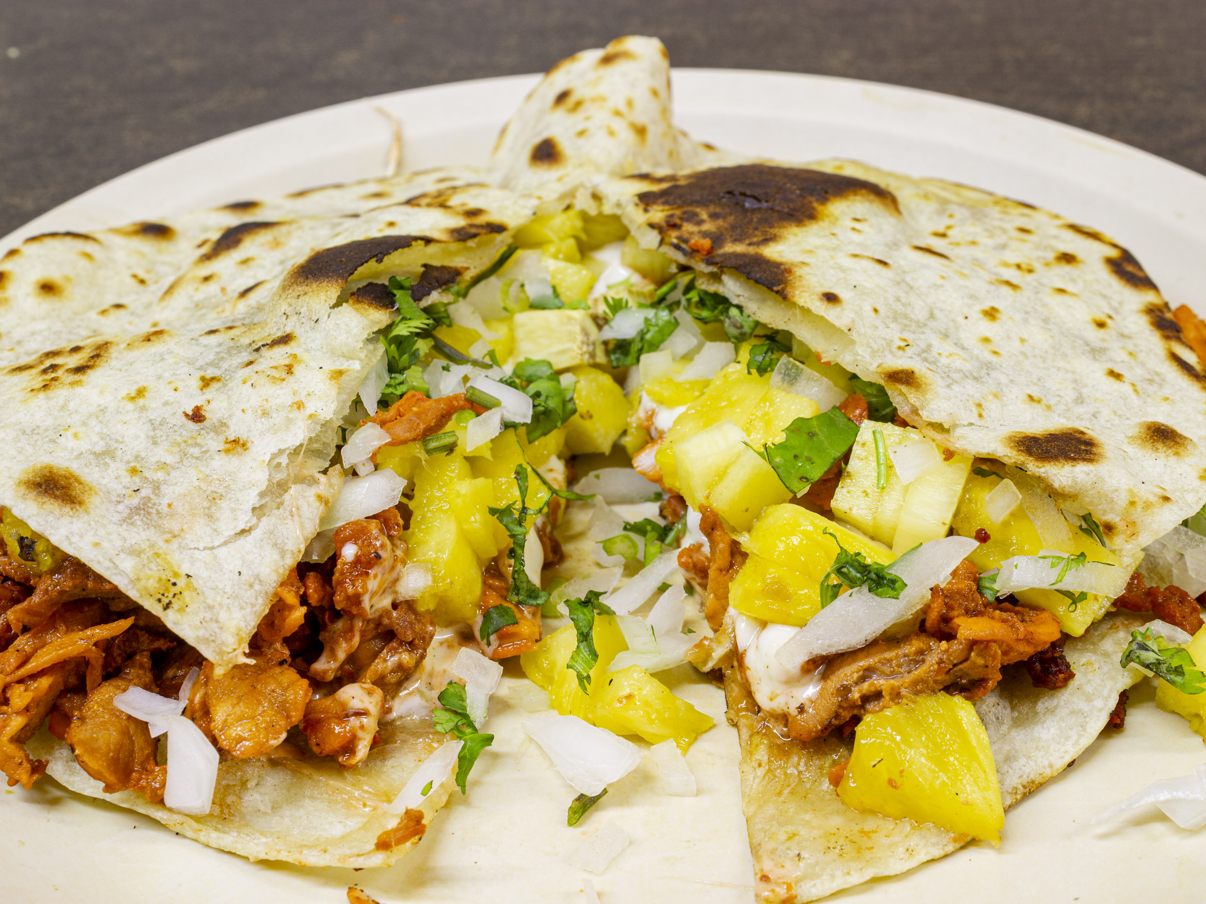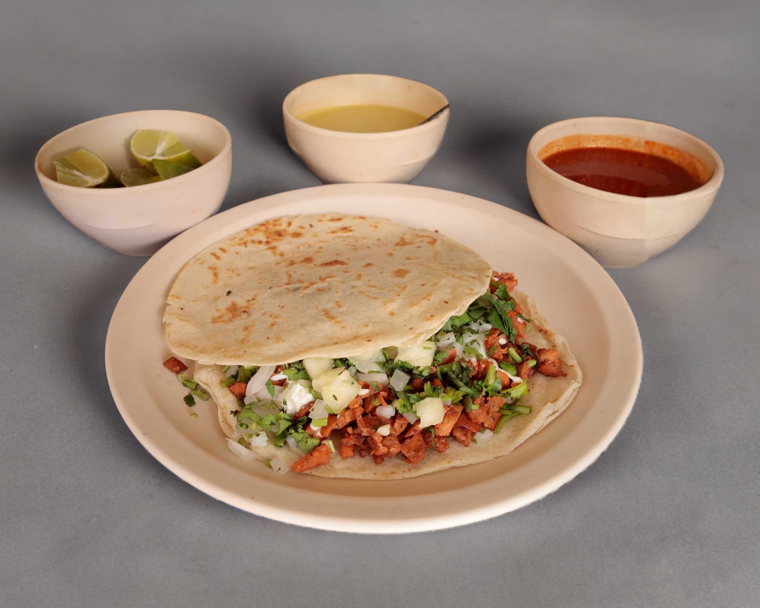 Chuleta, pastor, cebollitas, piña, se sirve con tortillas de harina.