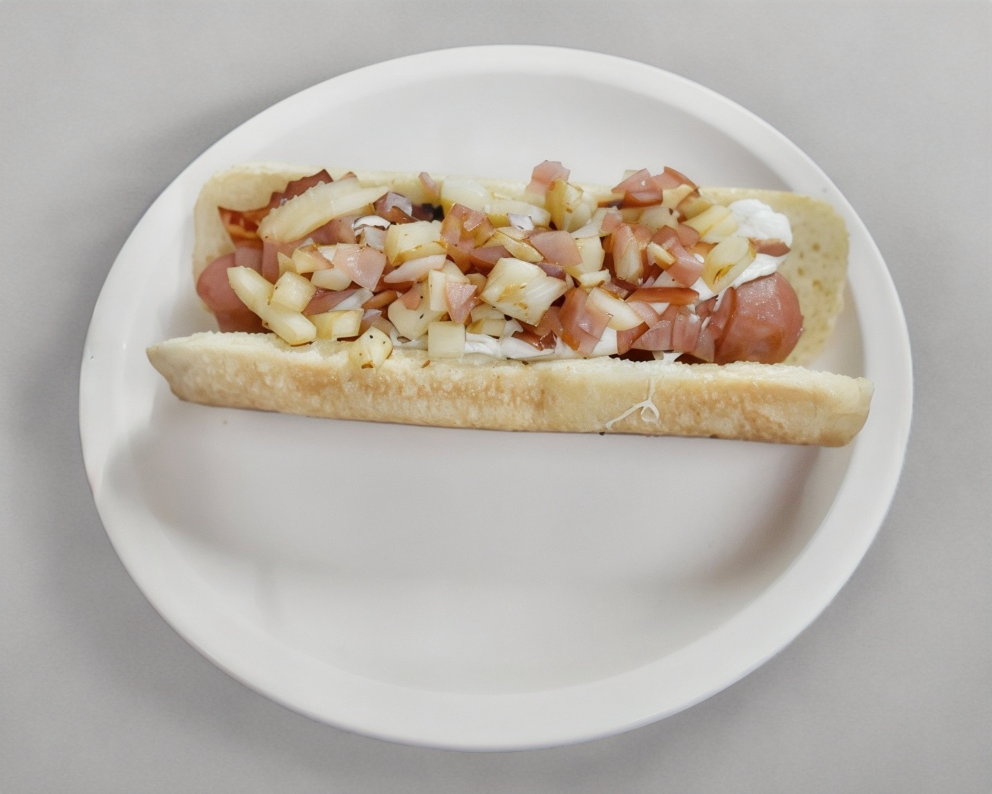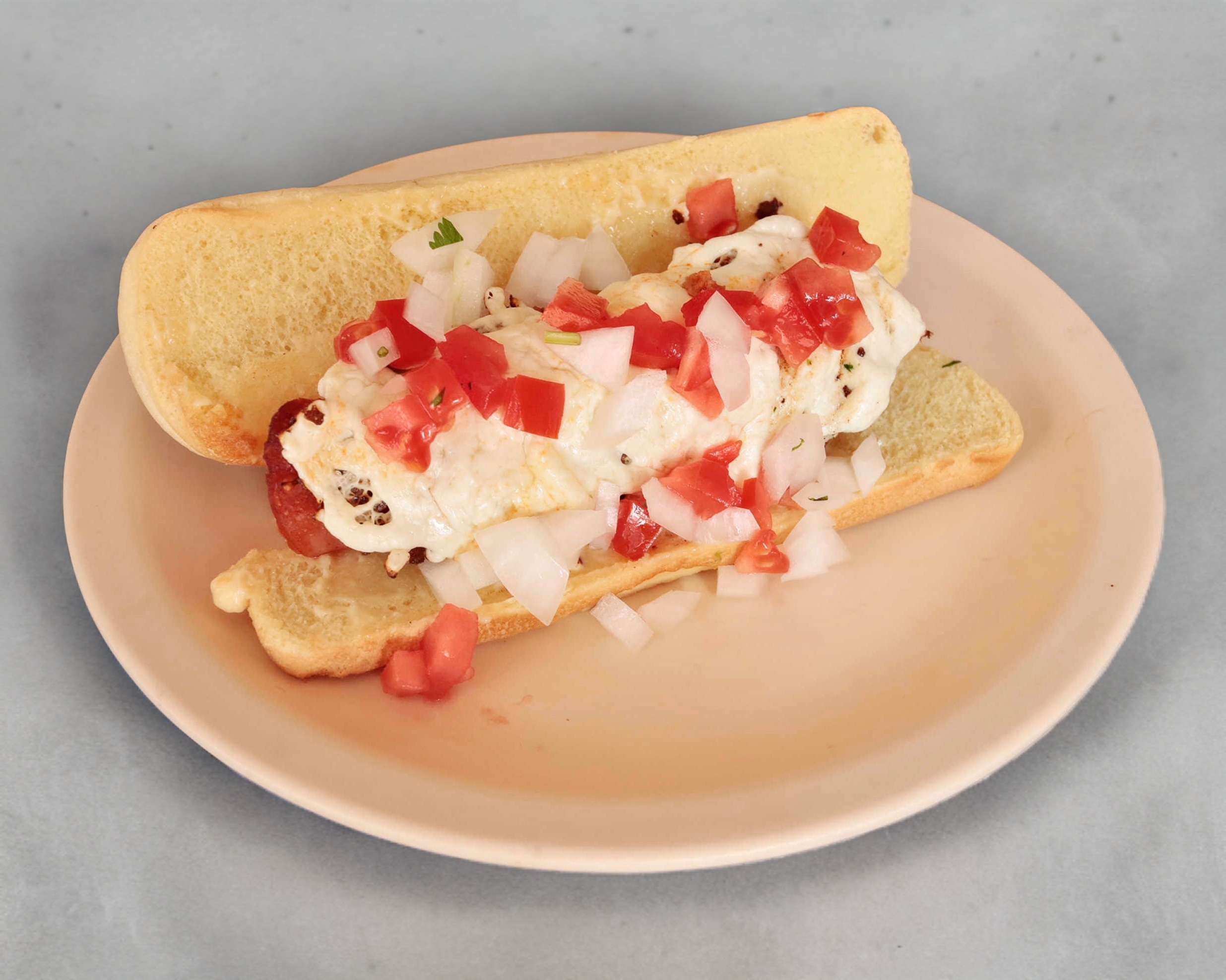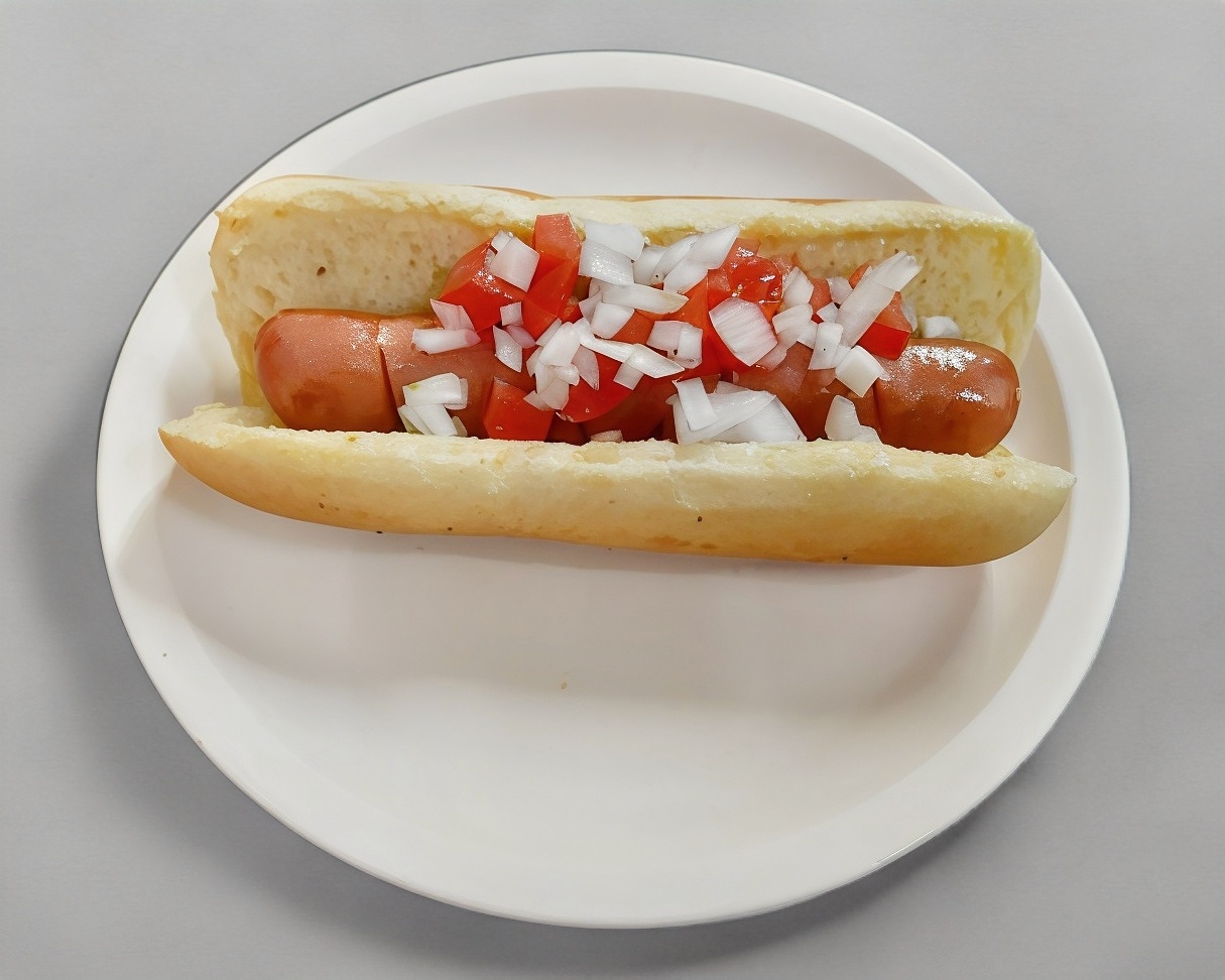 Salchicha, jitomate, cebolla y aderezo.