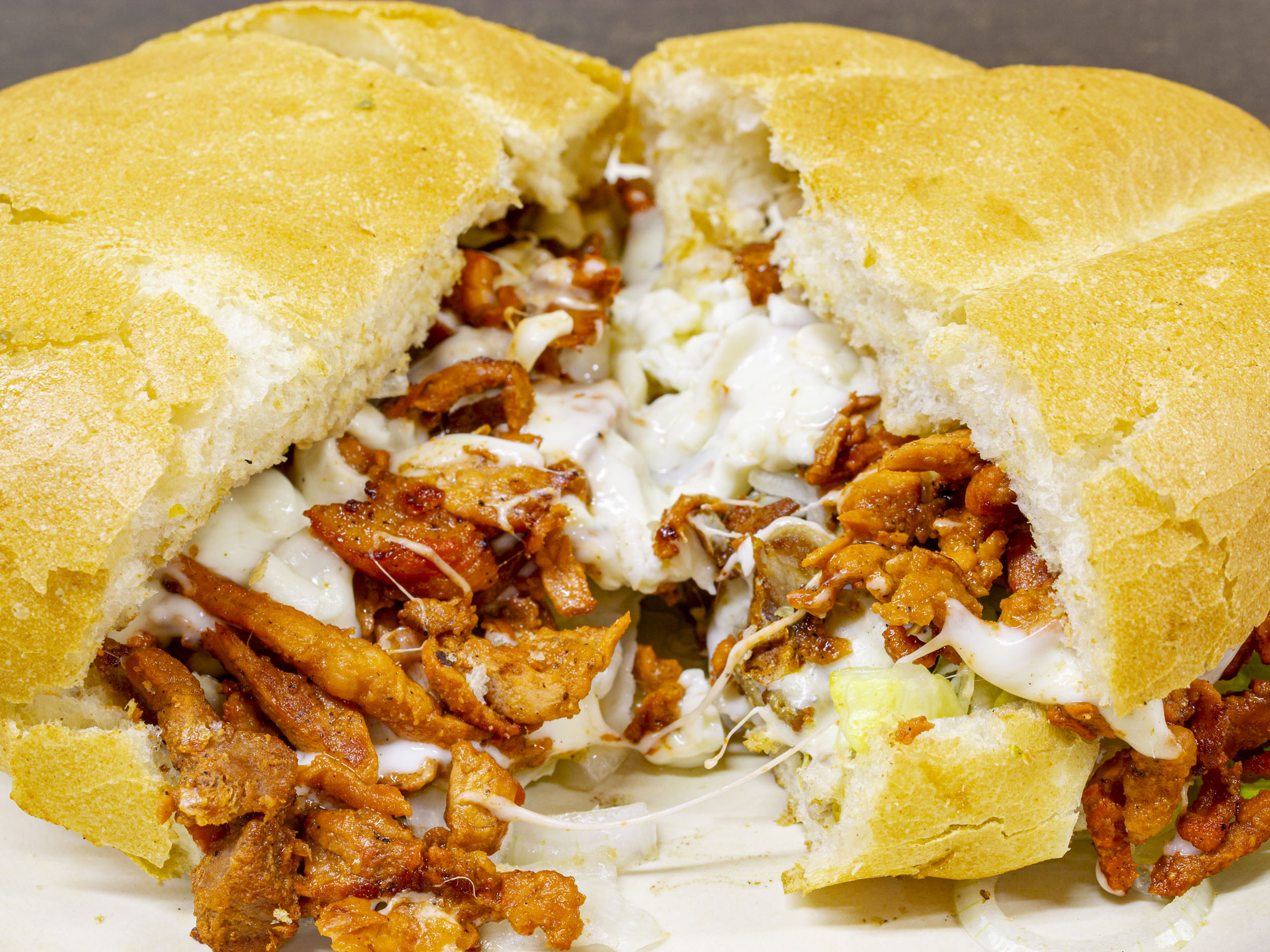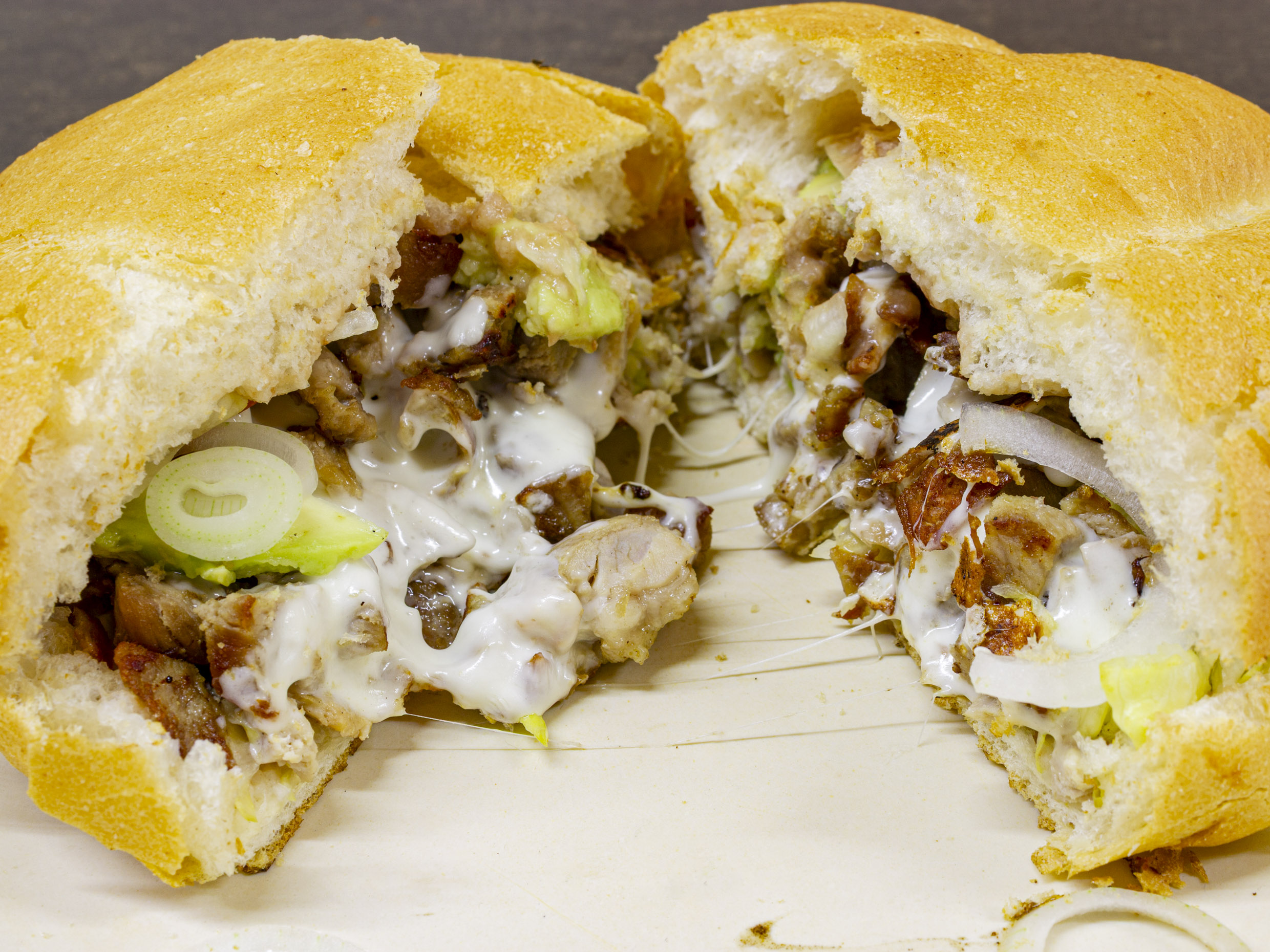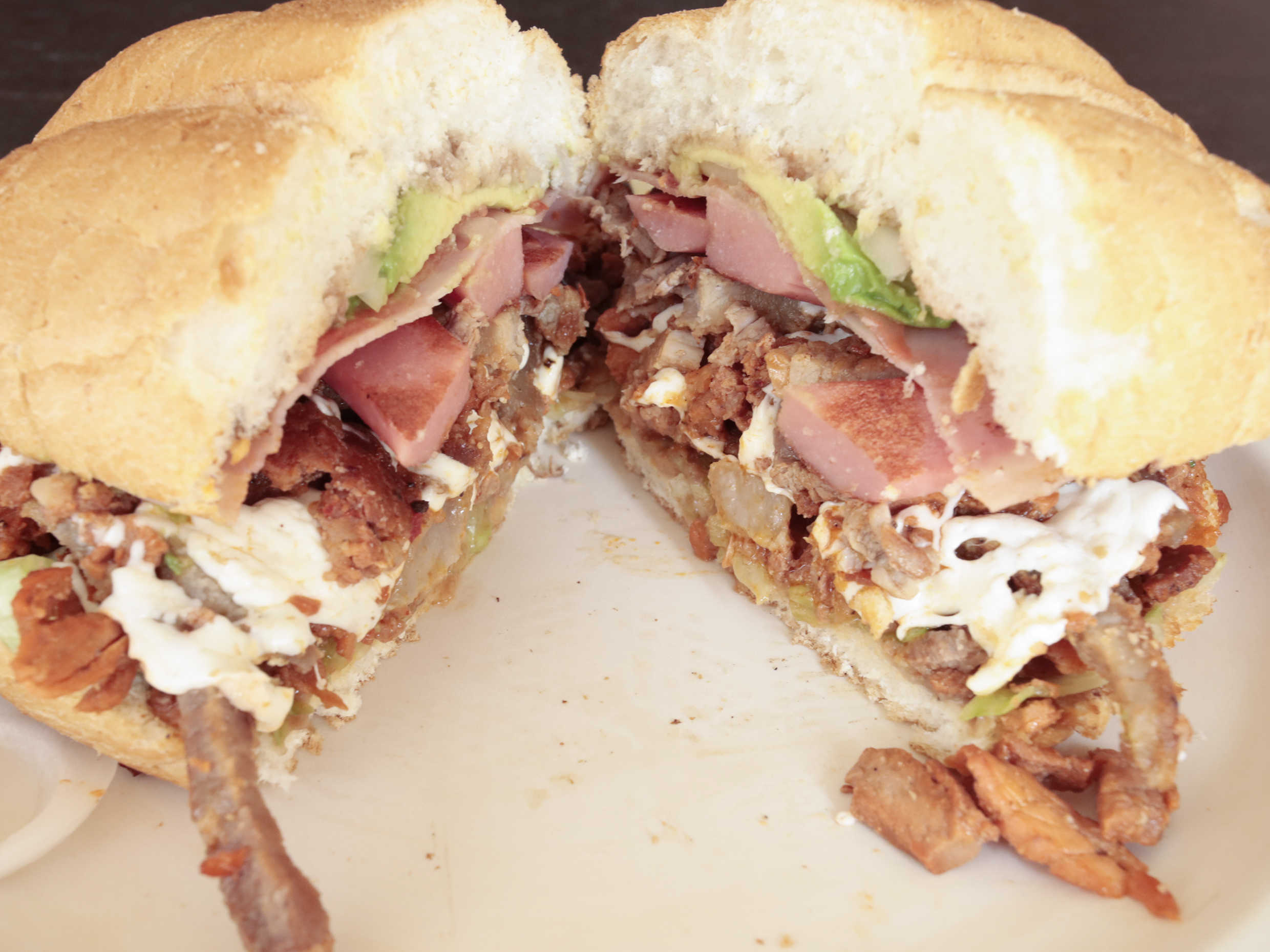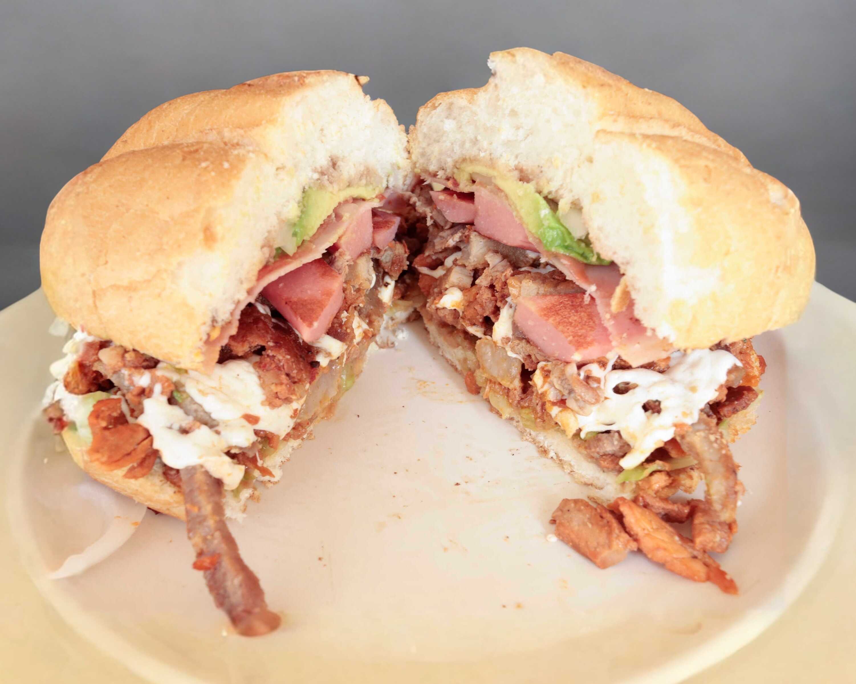 Pierna, milanesa, pastor, jamón y queso. Lleva frijoles, queso, lechuga, aguacate, cebolla y jitomate.