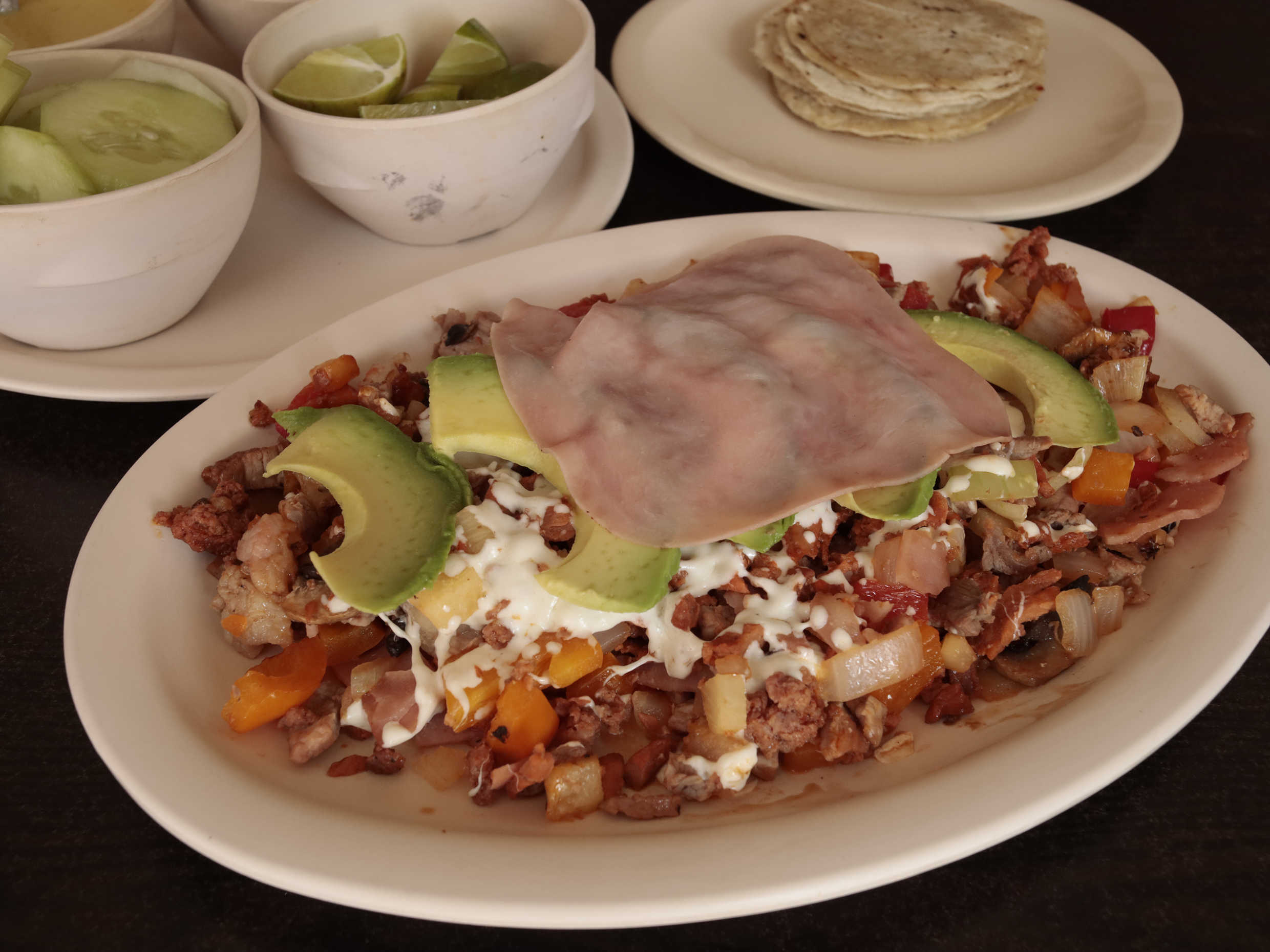 Chorizo, queso y jamón. Lleva frijoles, queso, lechuga, aguacate, cebolla y jitomate.