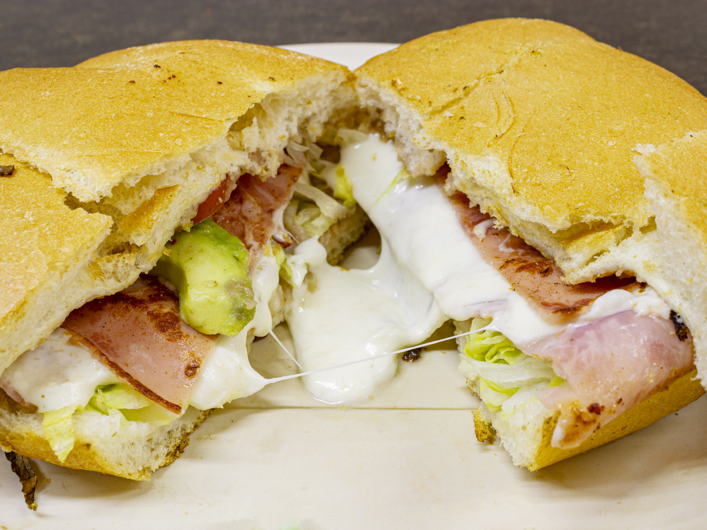Jamón, frijol, queso, lechuga, aguacate, cebolla y jitomate.