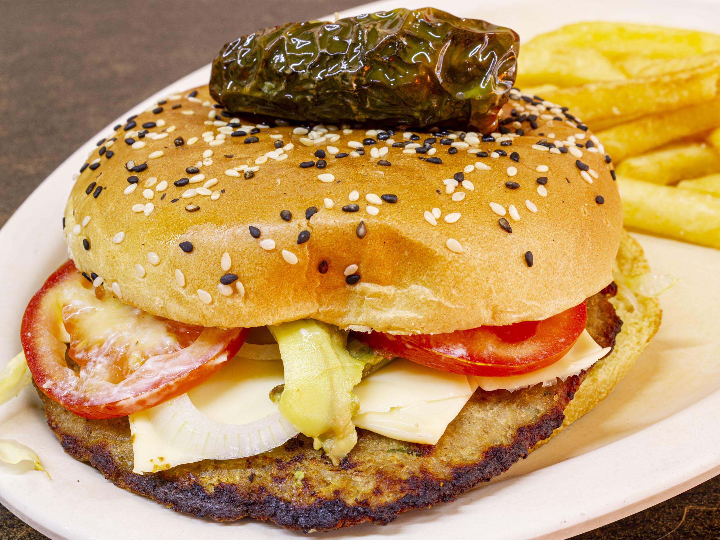 Lechuga, doble carne, queso, tocino, guacamole y aderezo.
