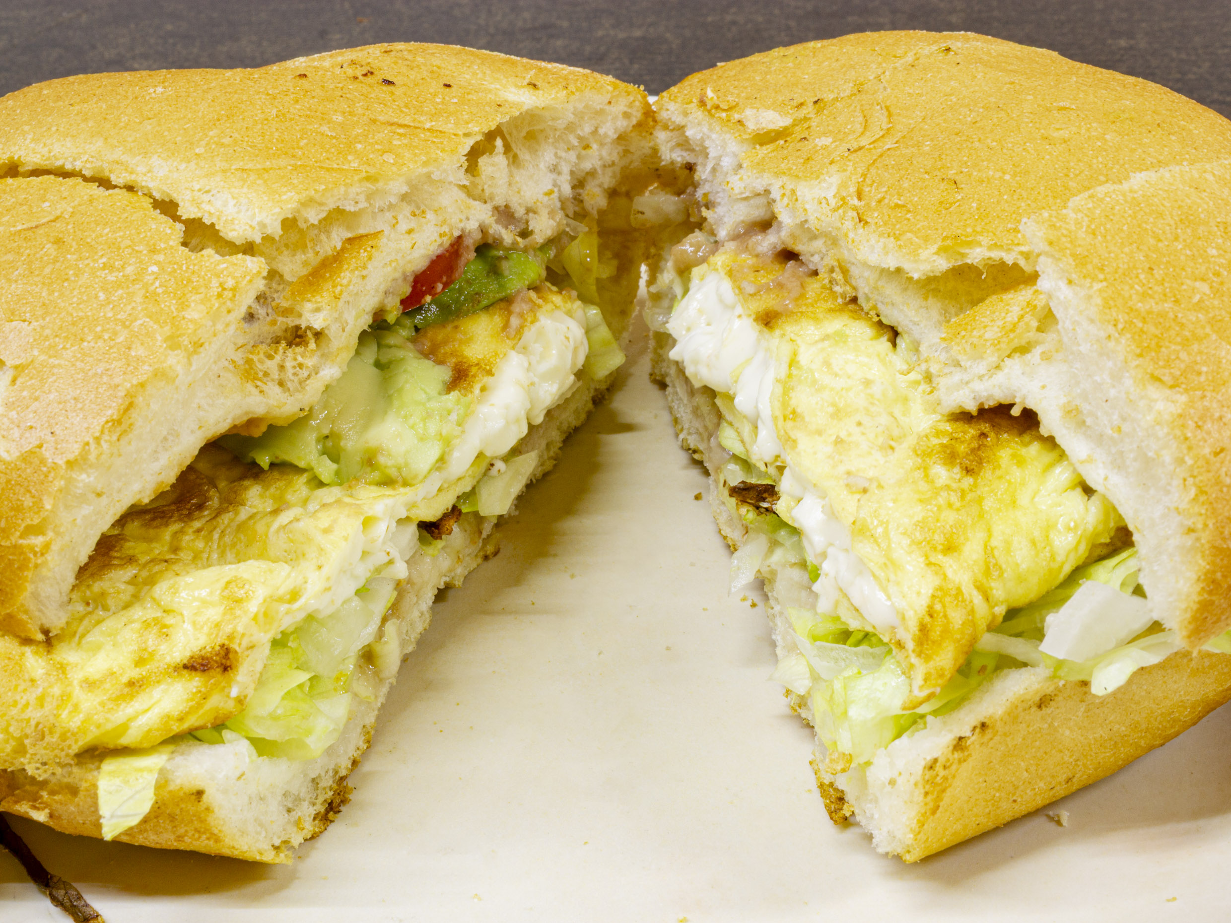 Milanesa, tocino, queso y salsa macha. Lleva frijoles, lechuga, aguacate, cebolla y jitomate.