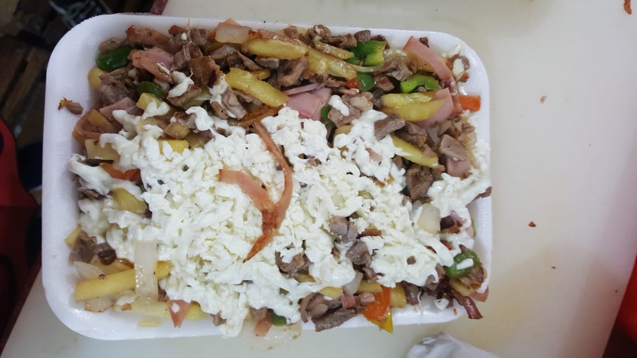 Bistec, cebolla, morrón, tocino y queso.