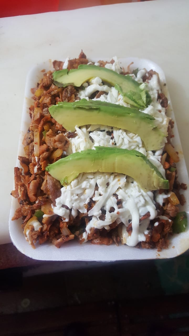 Pastor, cebolla, piña, queso, jitomate y aguacate.