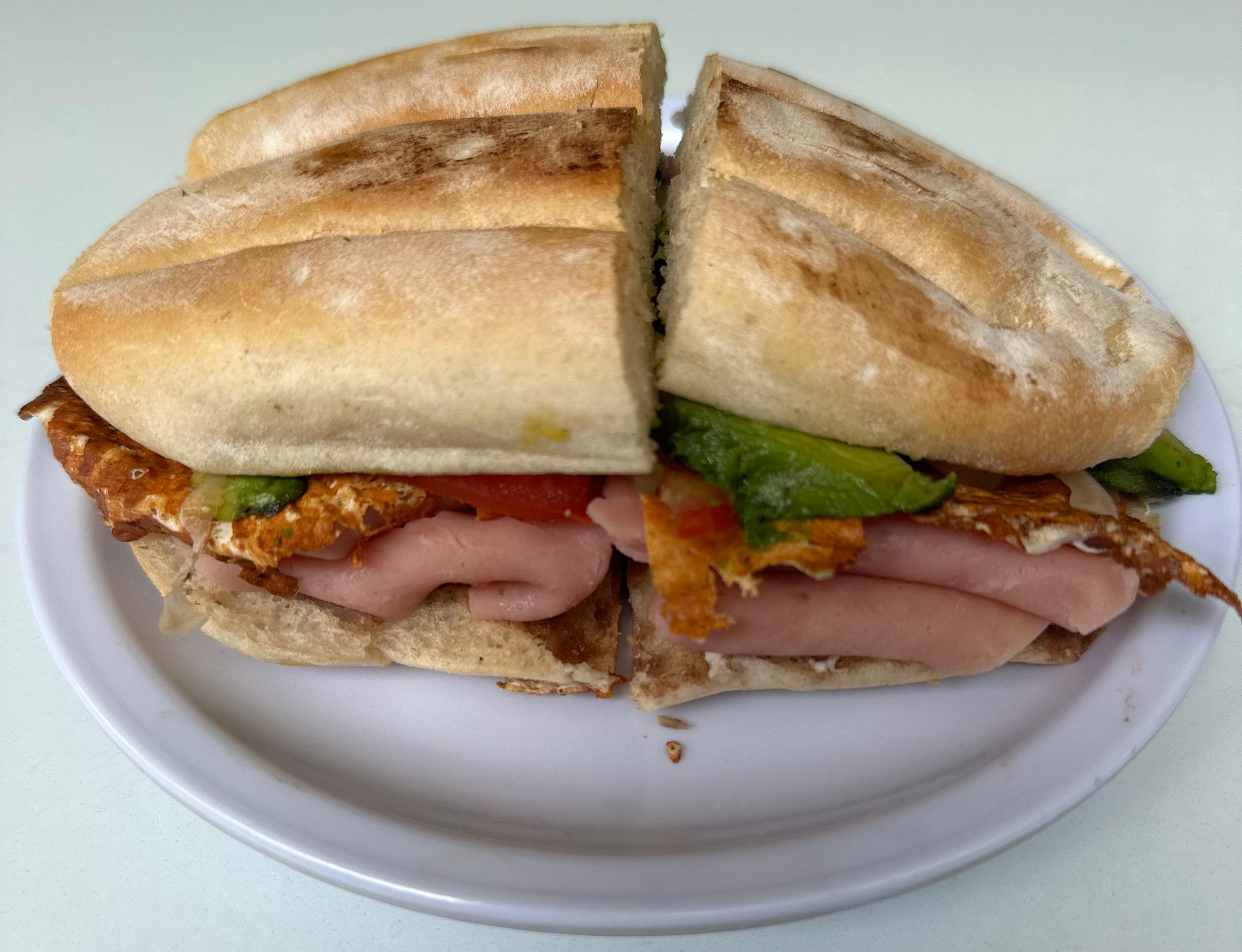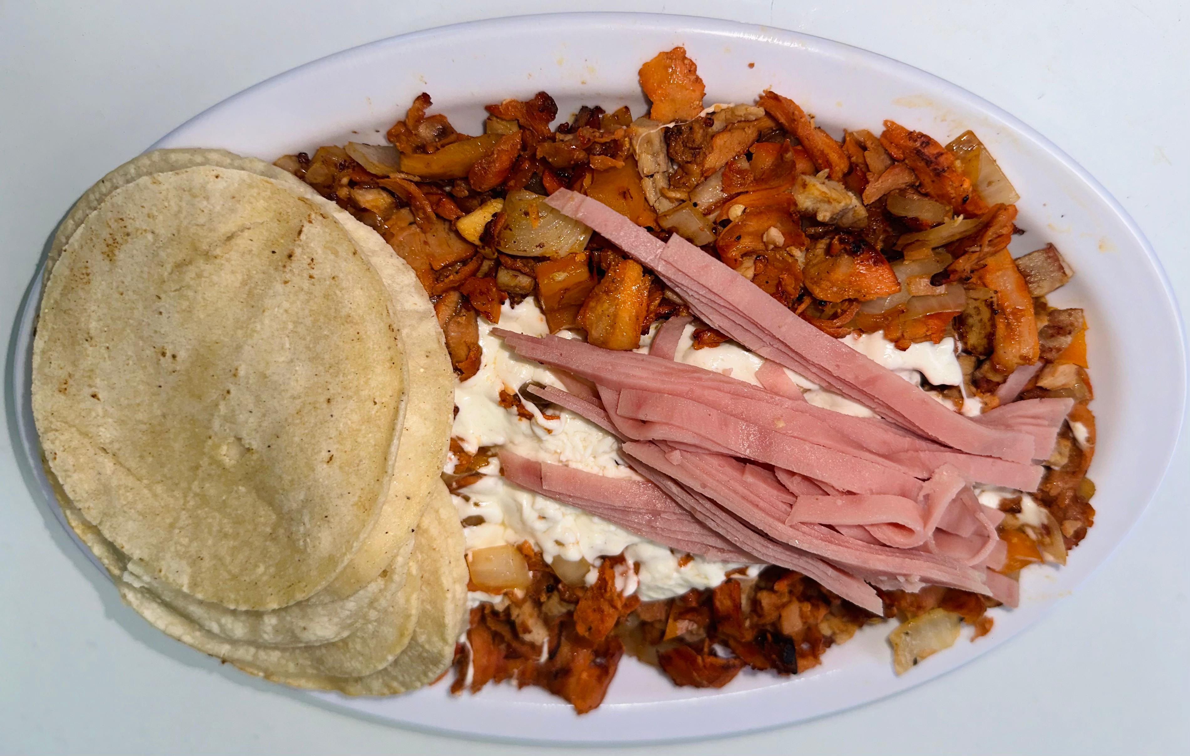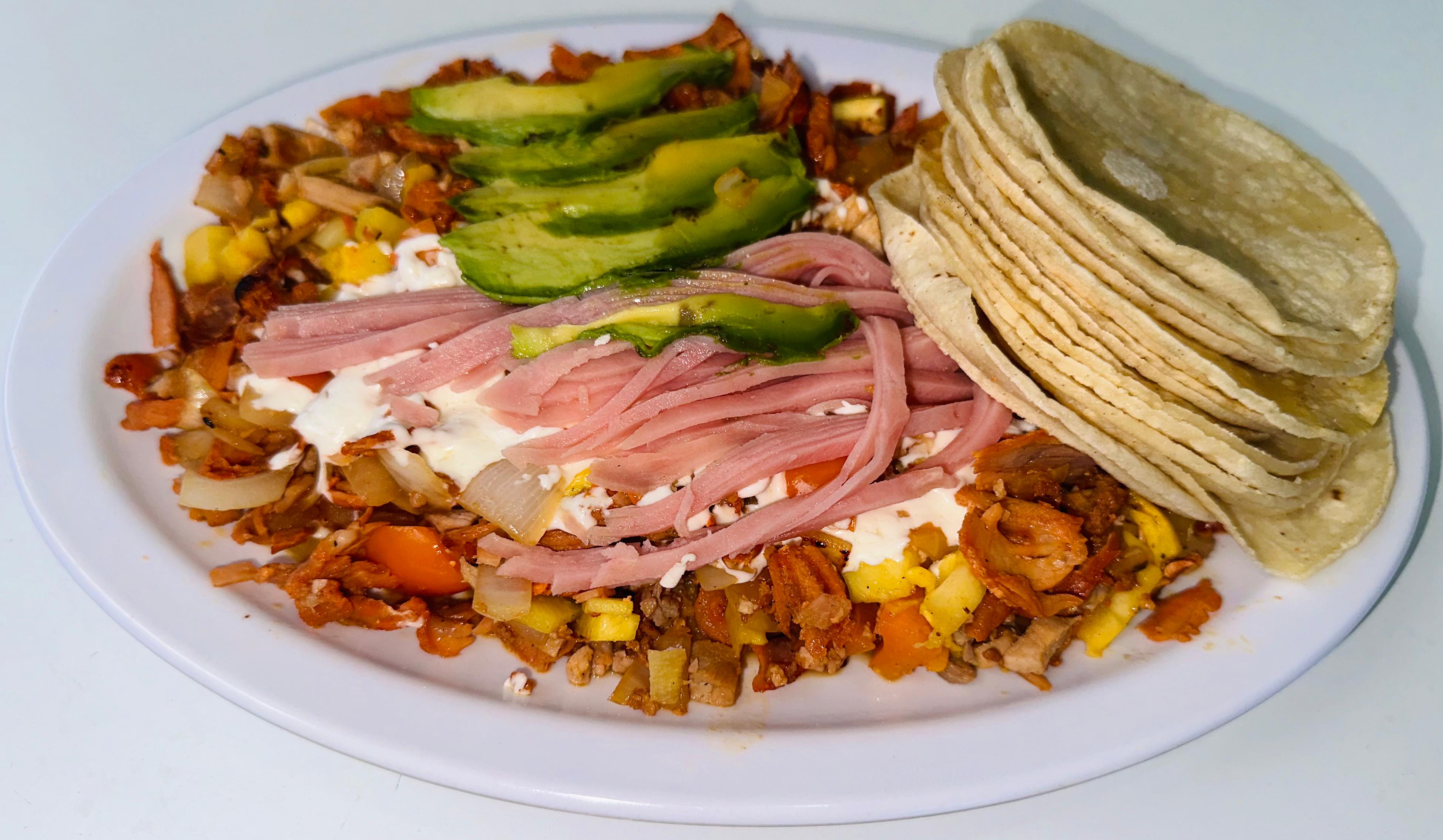 jamón con, frijol, cebolla, jitomate y aguacate.queso